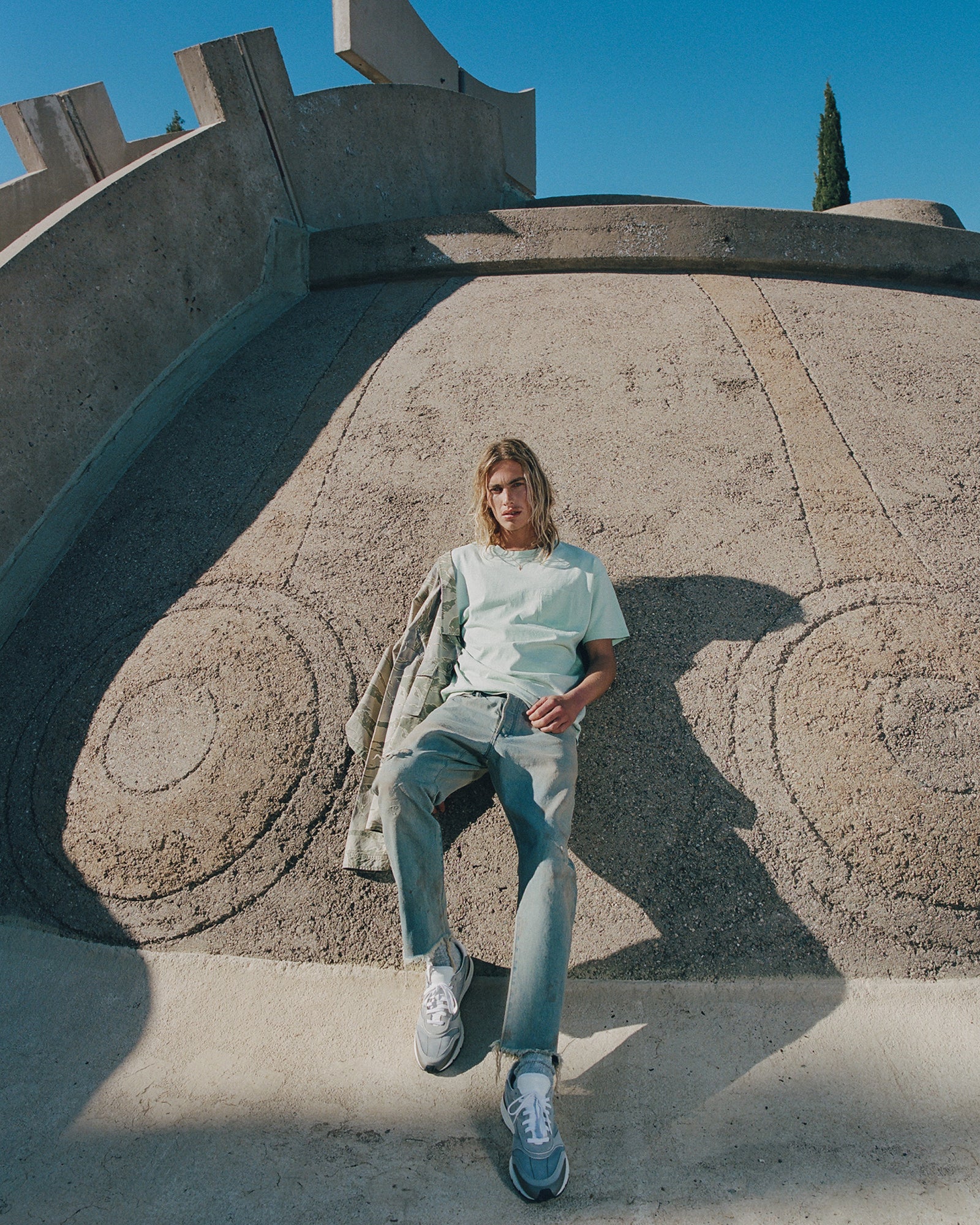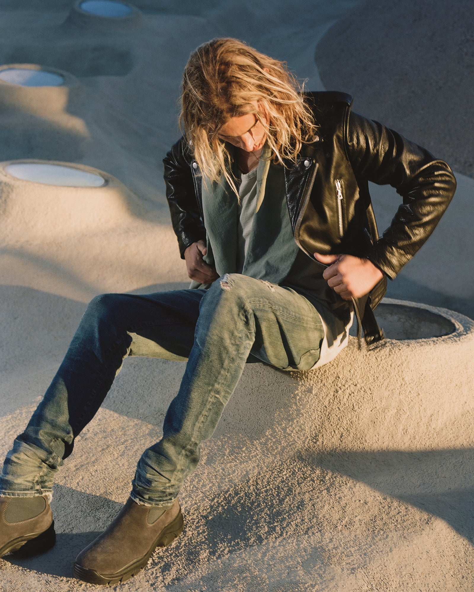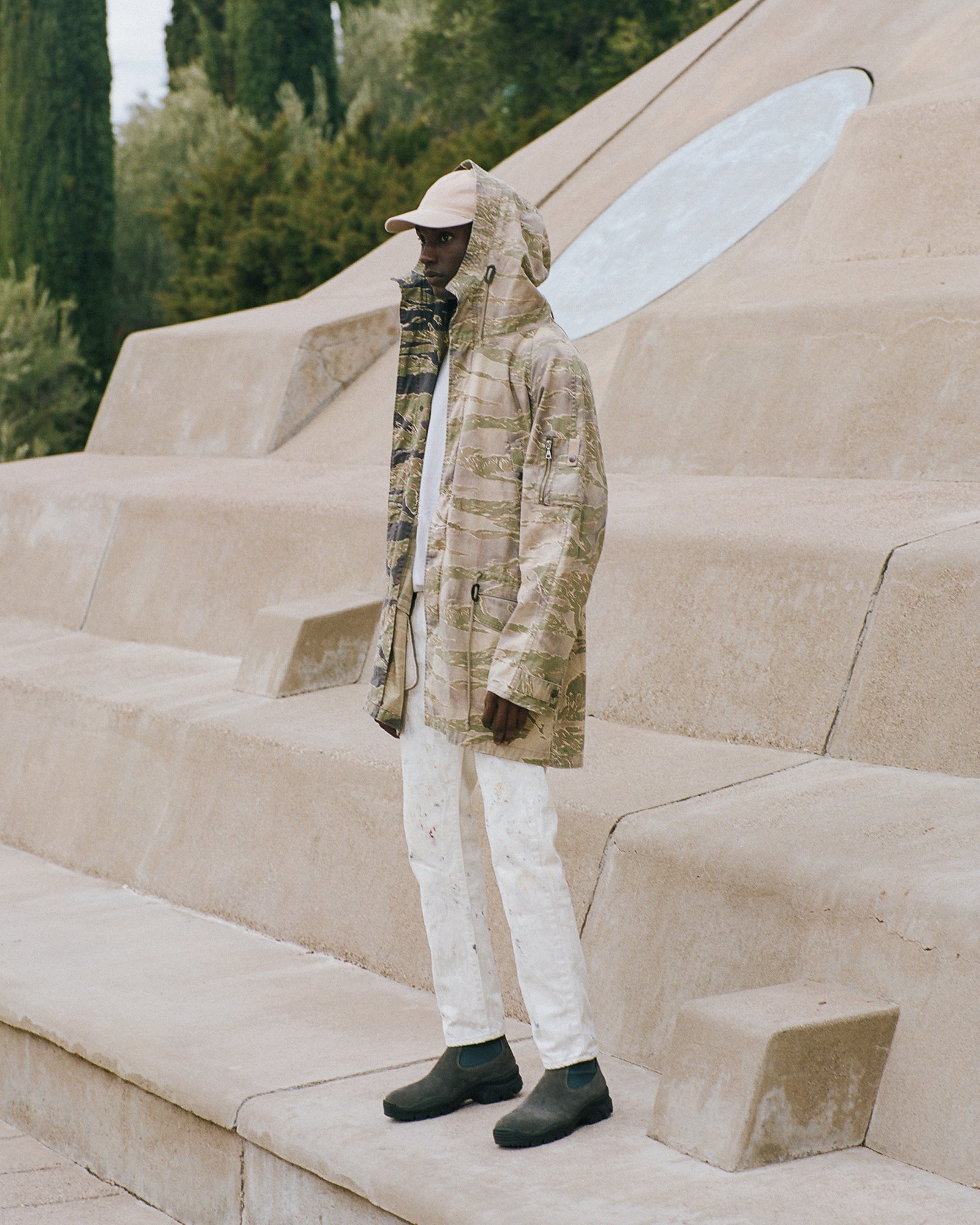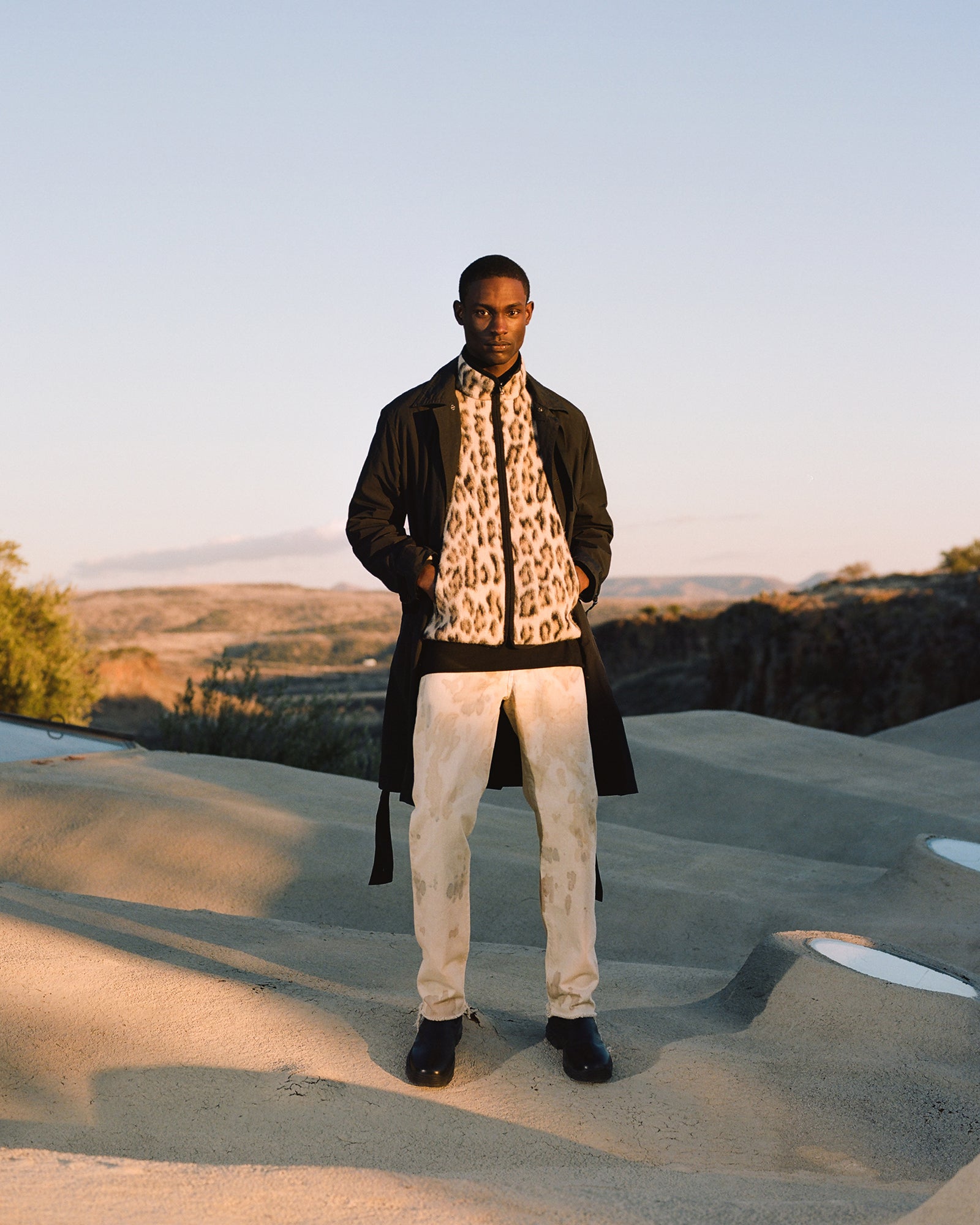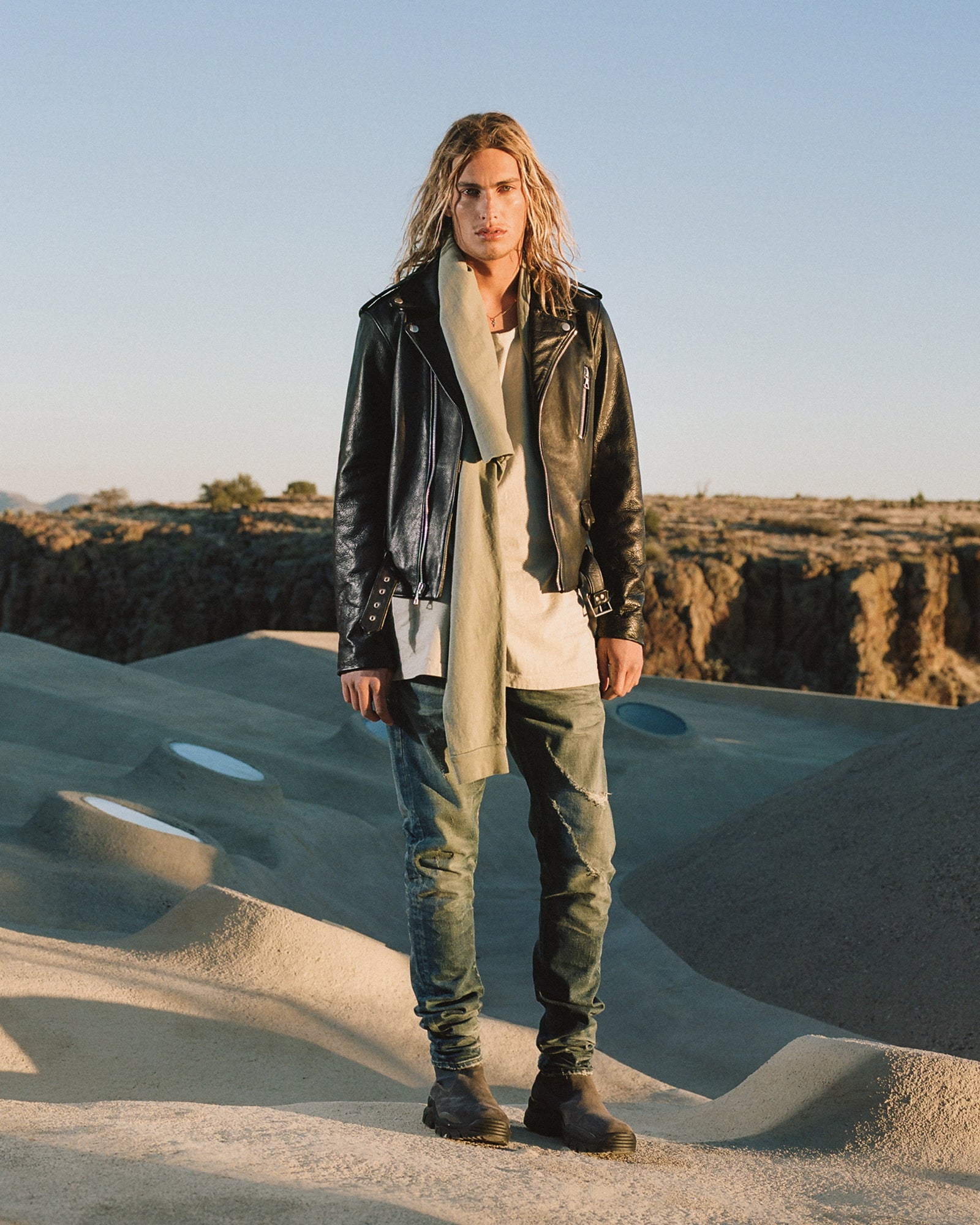 The Lookbook was shot on location at Arcosanti, an experimental town in Arizona thats concept was proposed by the Italian-American architect Paolo Soleri. Muted, earthen tones, seemingly washed by the sun, are featured throughout the collection. A tiger-camo trench, deliberately finished with a laborious bleaching process, is paired with hand painted denim, inspired by Jackson Pollock. Looks are elevated with new leather developments, and finished with the debut of a complete in-line footwear program.