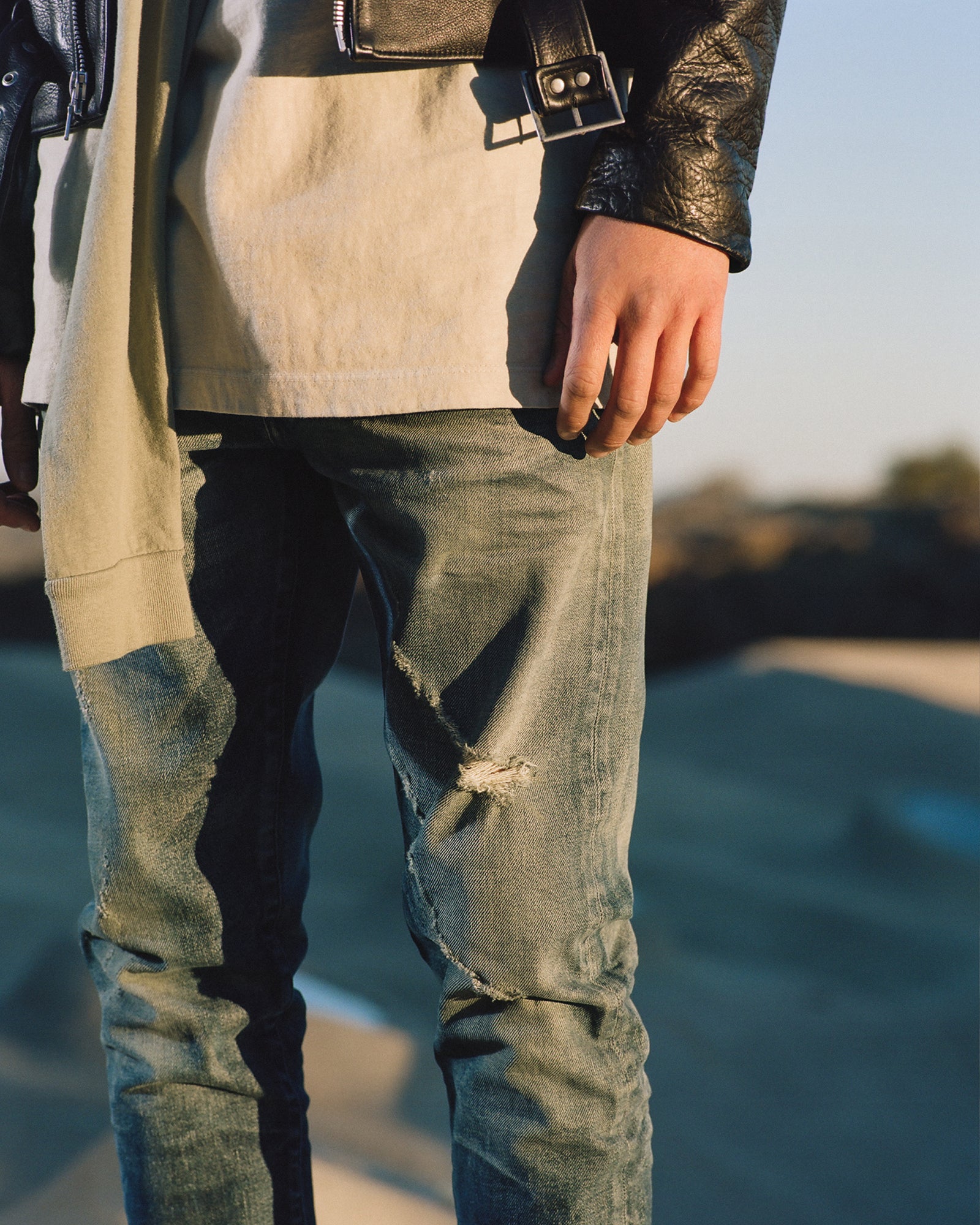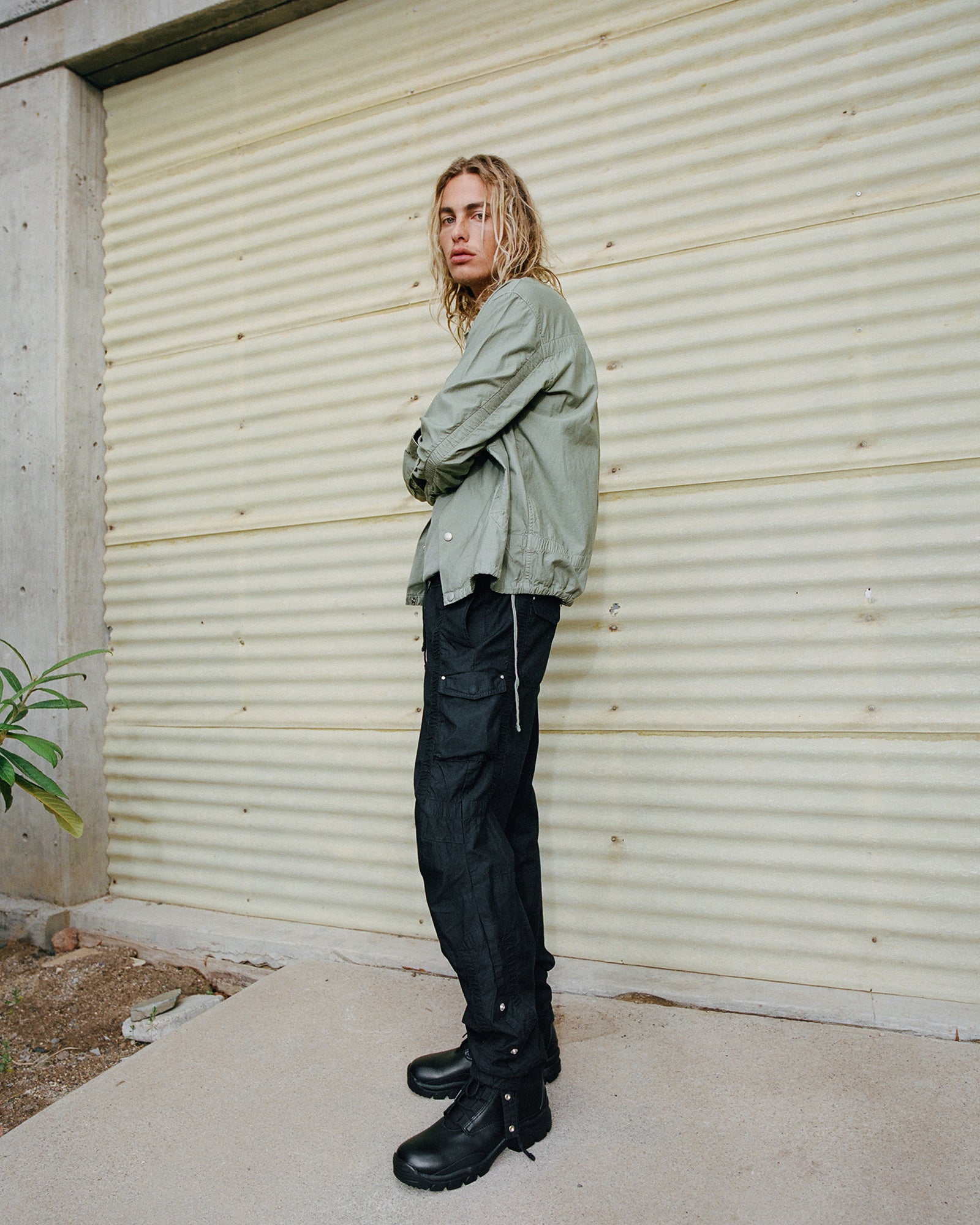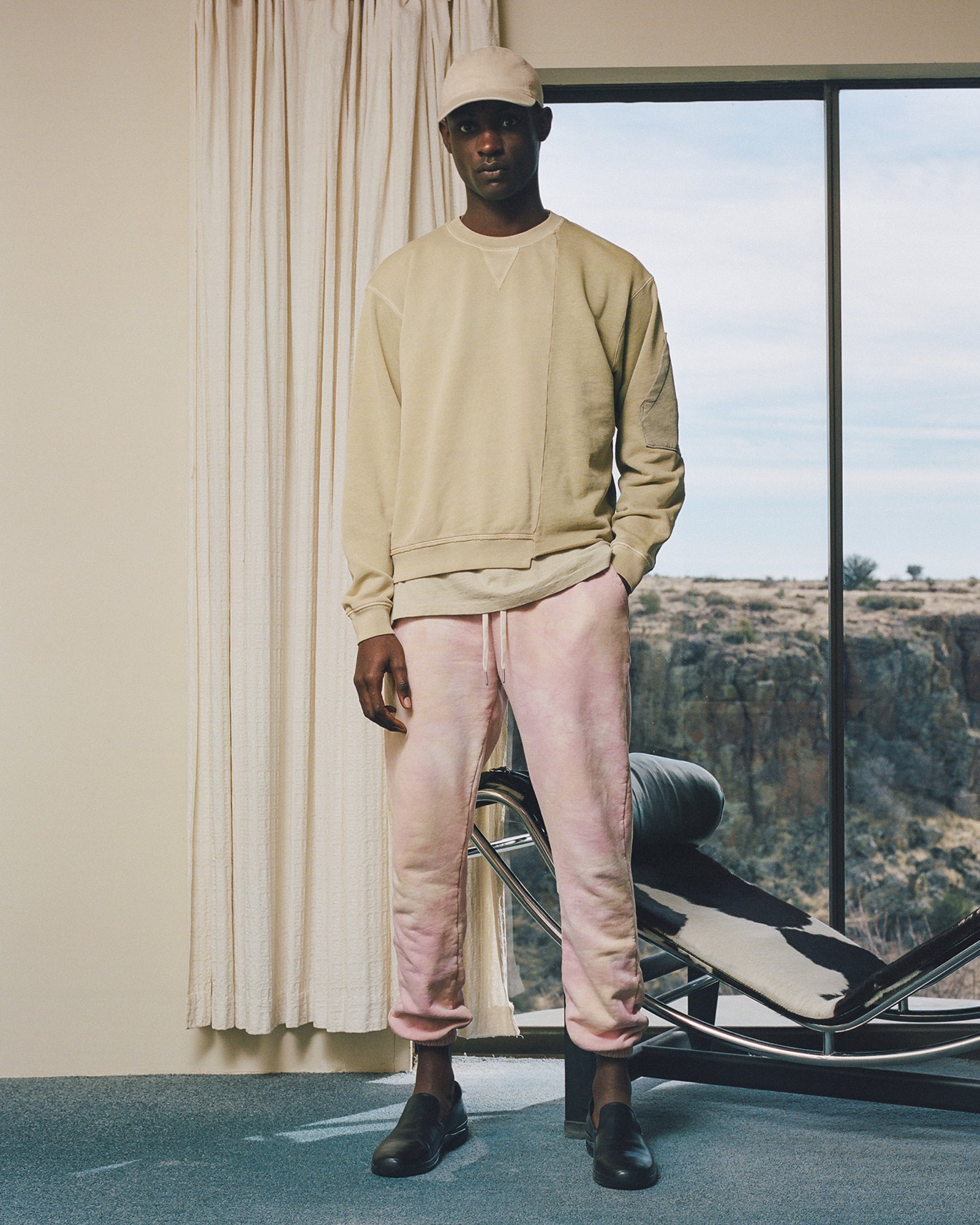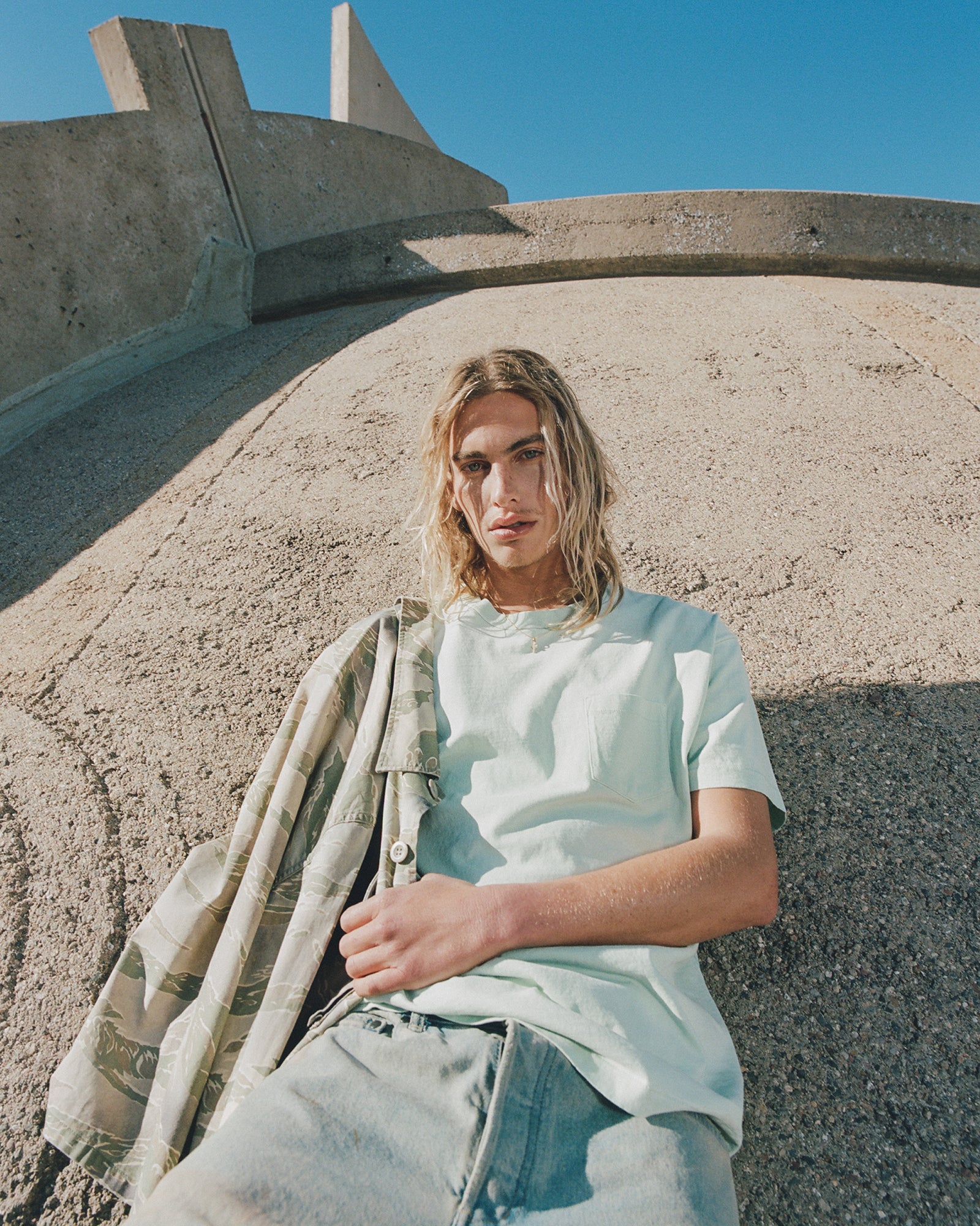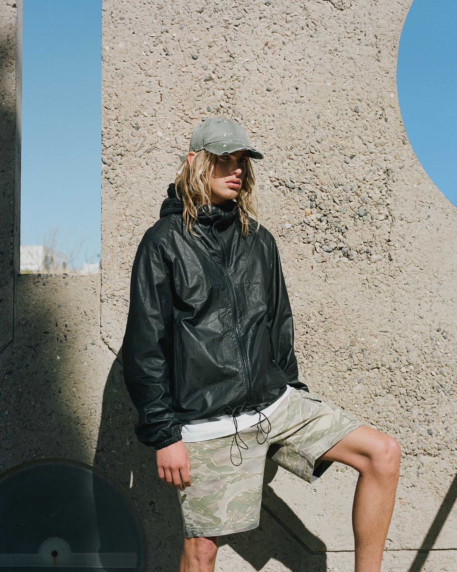 The Lookbook was shot on location at Arcosanti, an experimental town in Arizona thats concept was proposed by the Italian-American architect Paolo Soleri. Muted, earthen tones, seemingly washed by the sun, are featured throughout the collection. A tiger-camo trench, deliberately finished with a laborious bleaching process, is paired with hand painted denim, inspired by Jackson Pollock. Looks are elevated with new leather developments, and finished with the debut of a complete in-line footwear program.