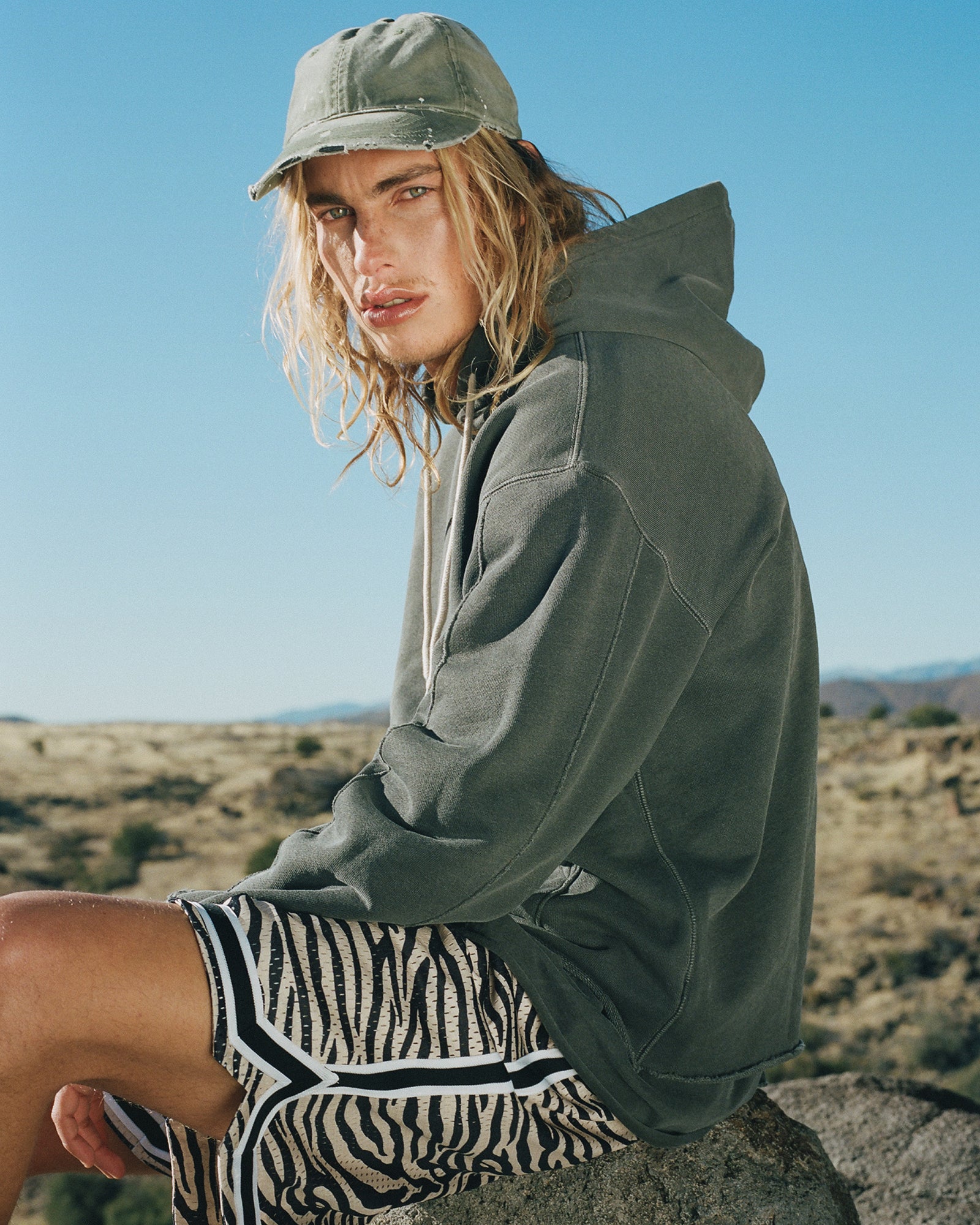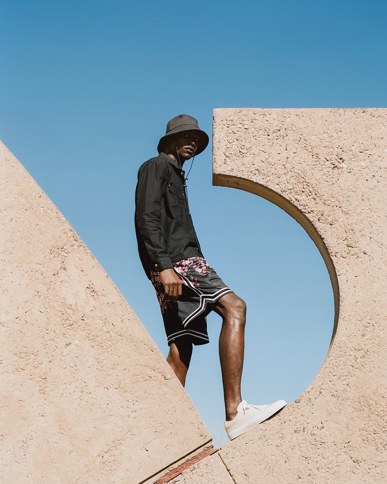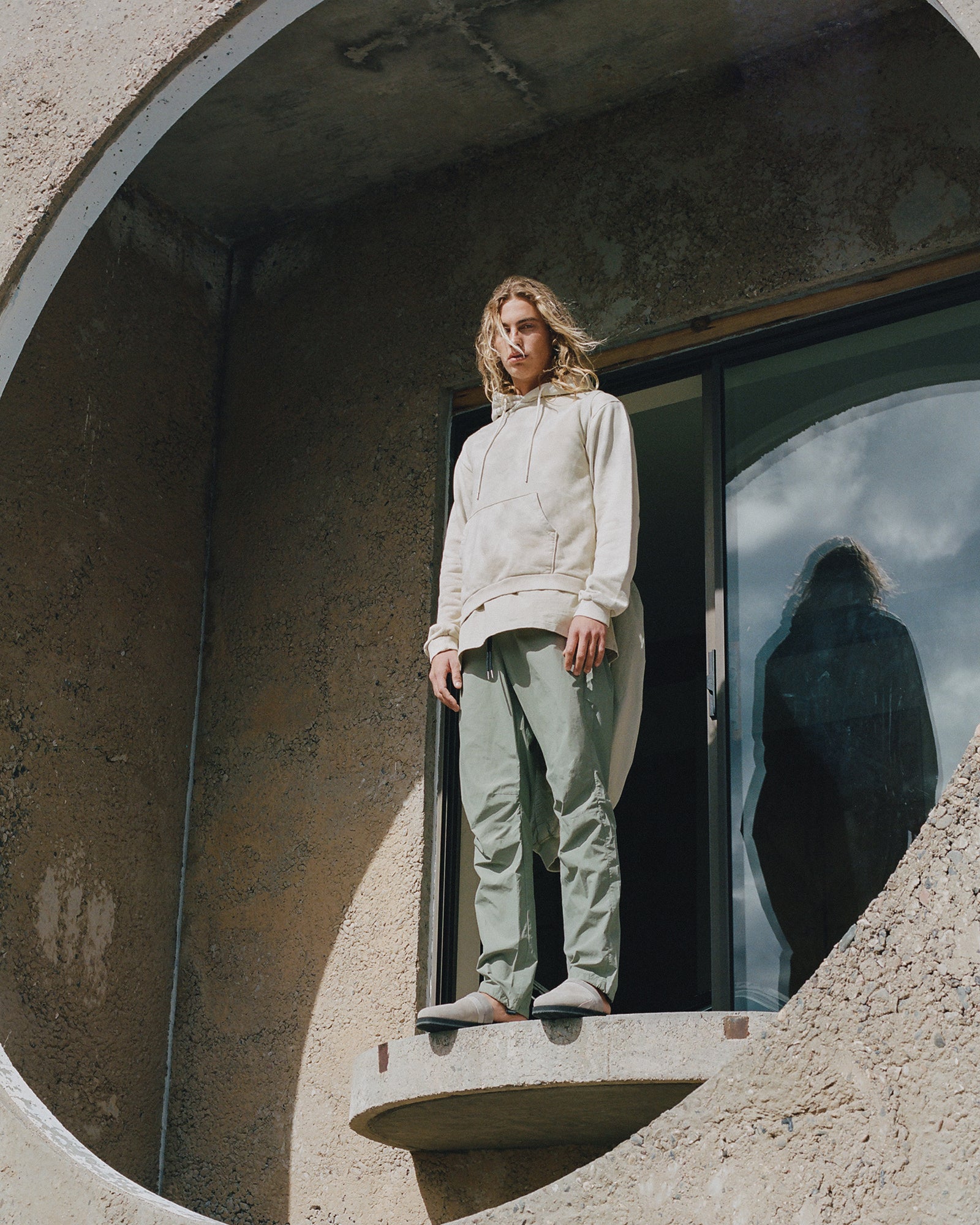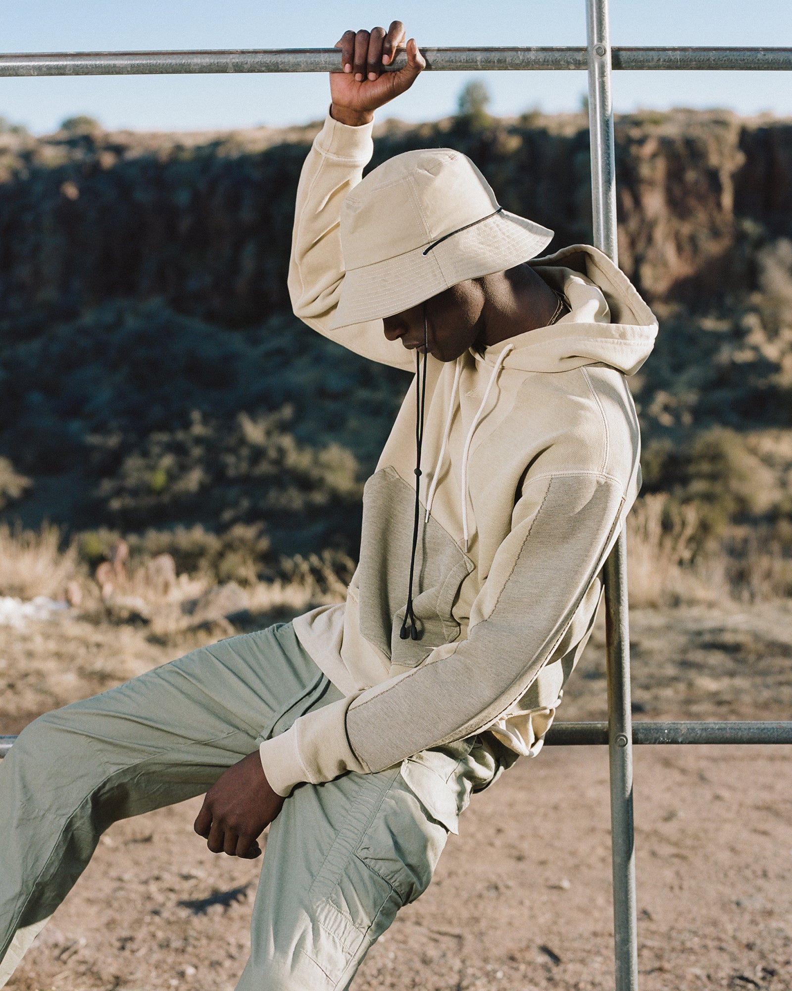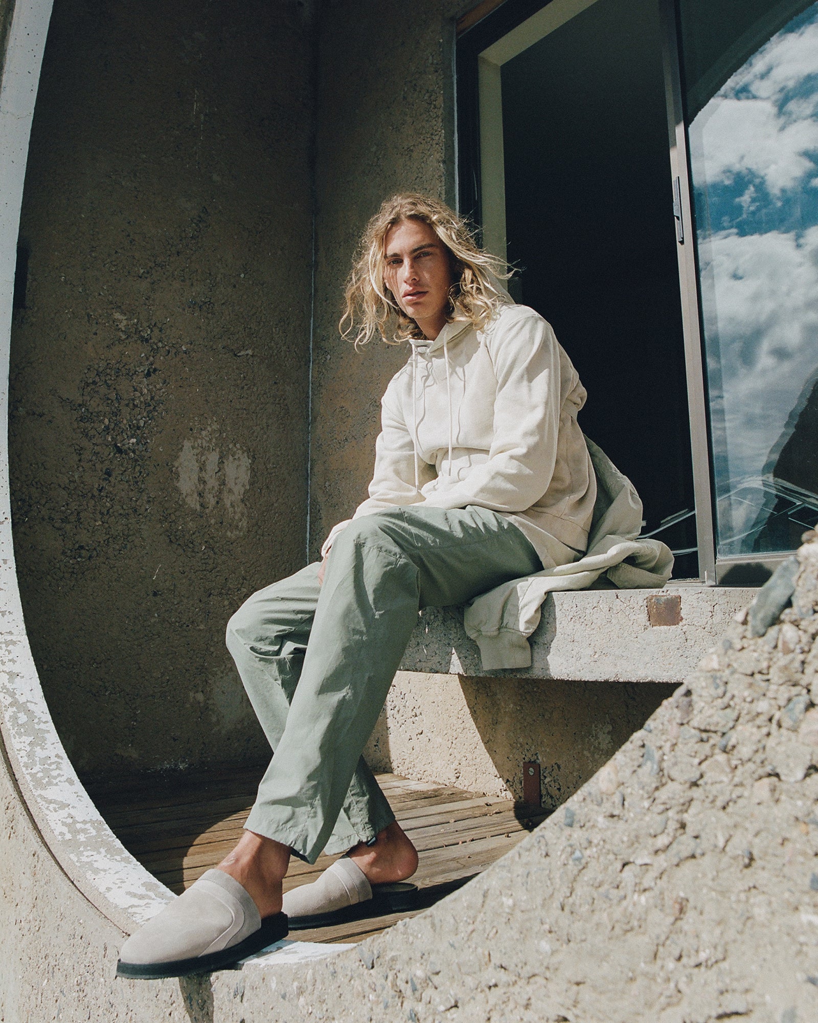 The Lookbook was shot on location at Arcosanti, an experimental town in Arizona thats concept was proposed by the Italian-American architect Paolo Soleri. Muted, earthen tones, seemingly washed by the sun, are featured throughout the collection. A tiger-camo trench, deliberately finished with a laborious bleaching process, is paired with hand painted denim, inspired by Jackson Pollock. Looks are elevated with new leather developments, and finished with the debut of a complete in-line footwear program.