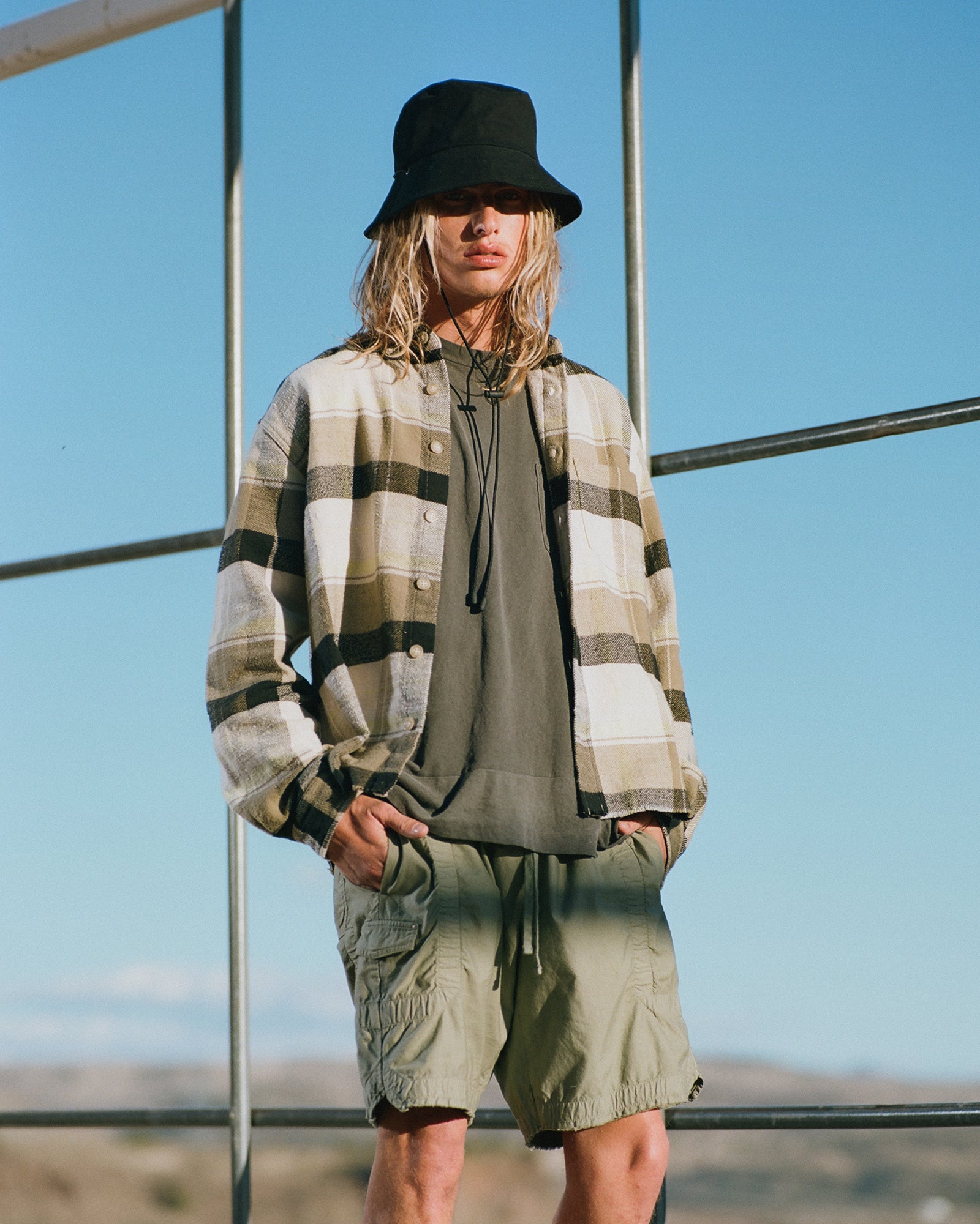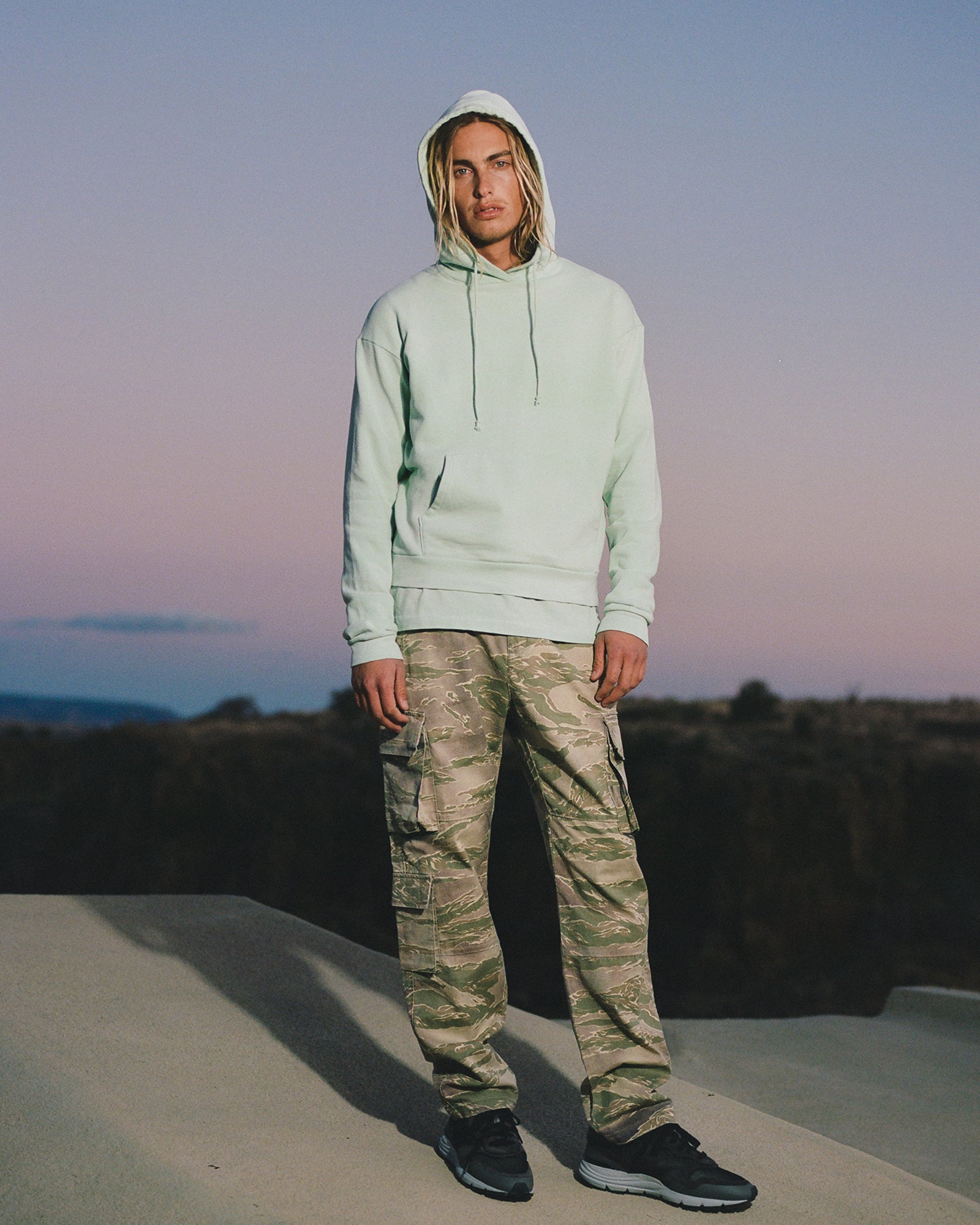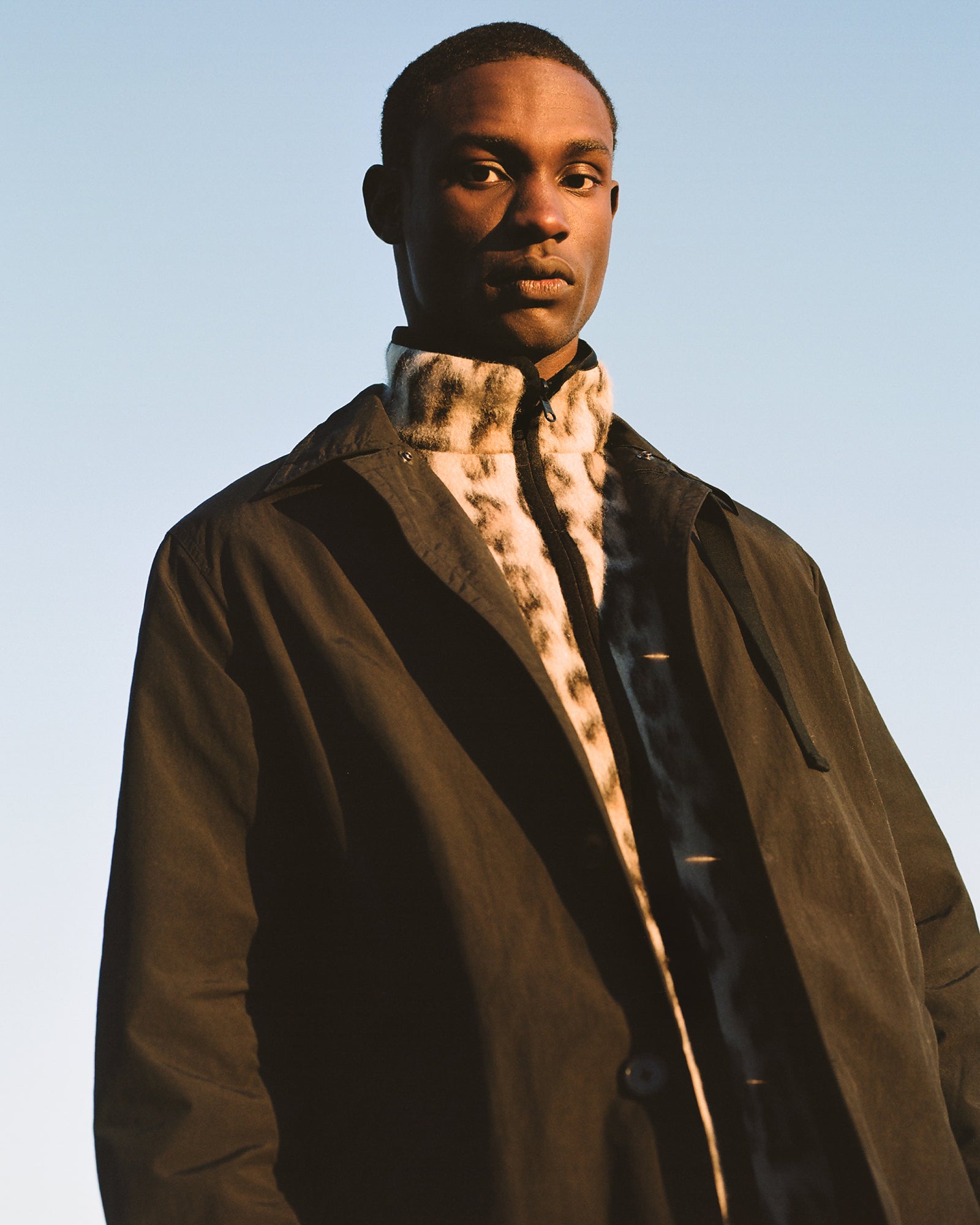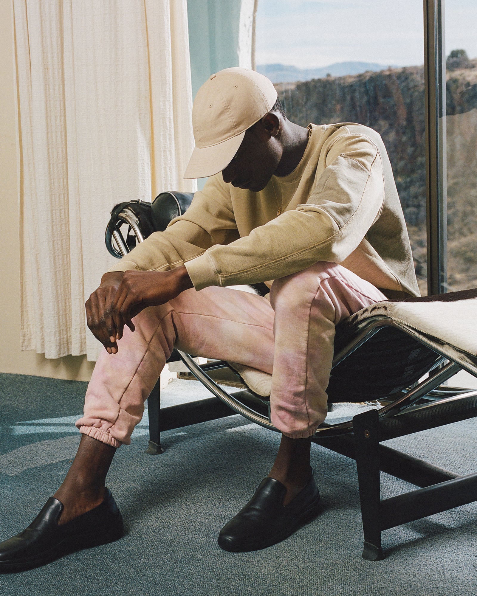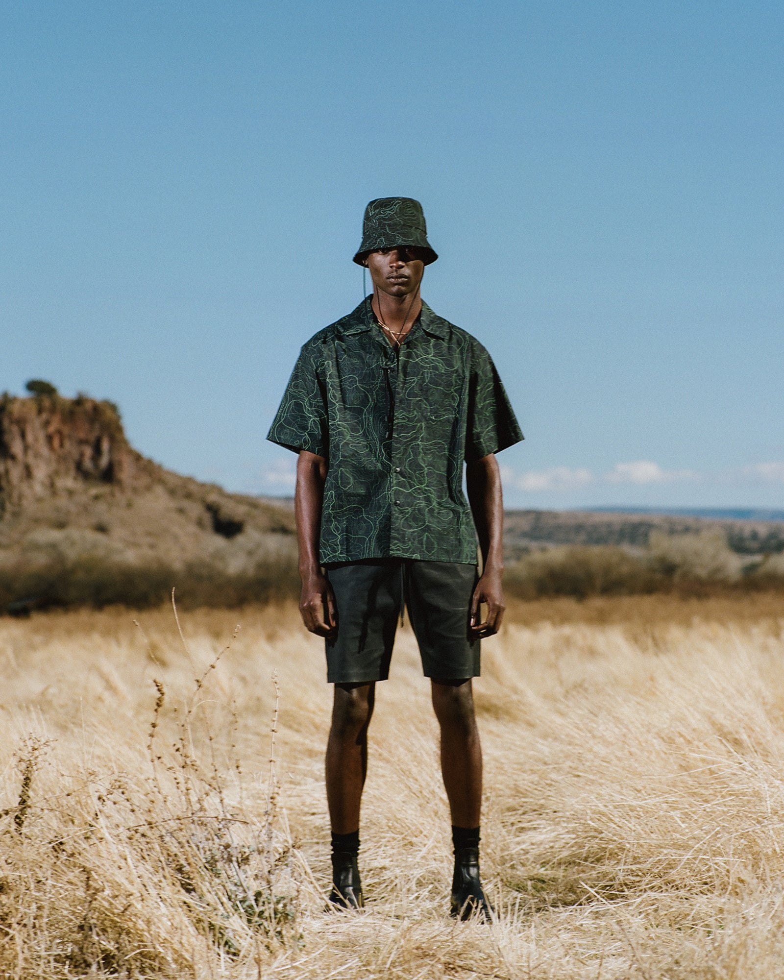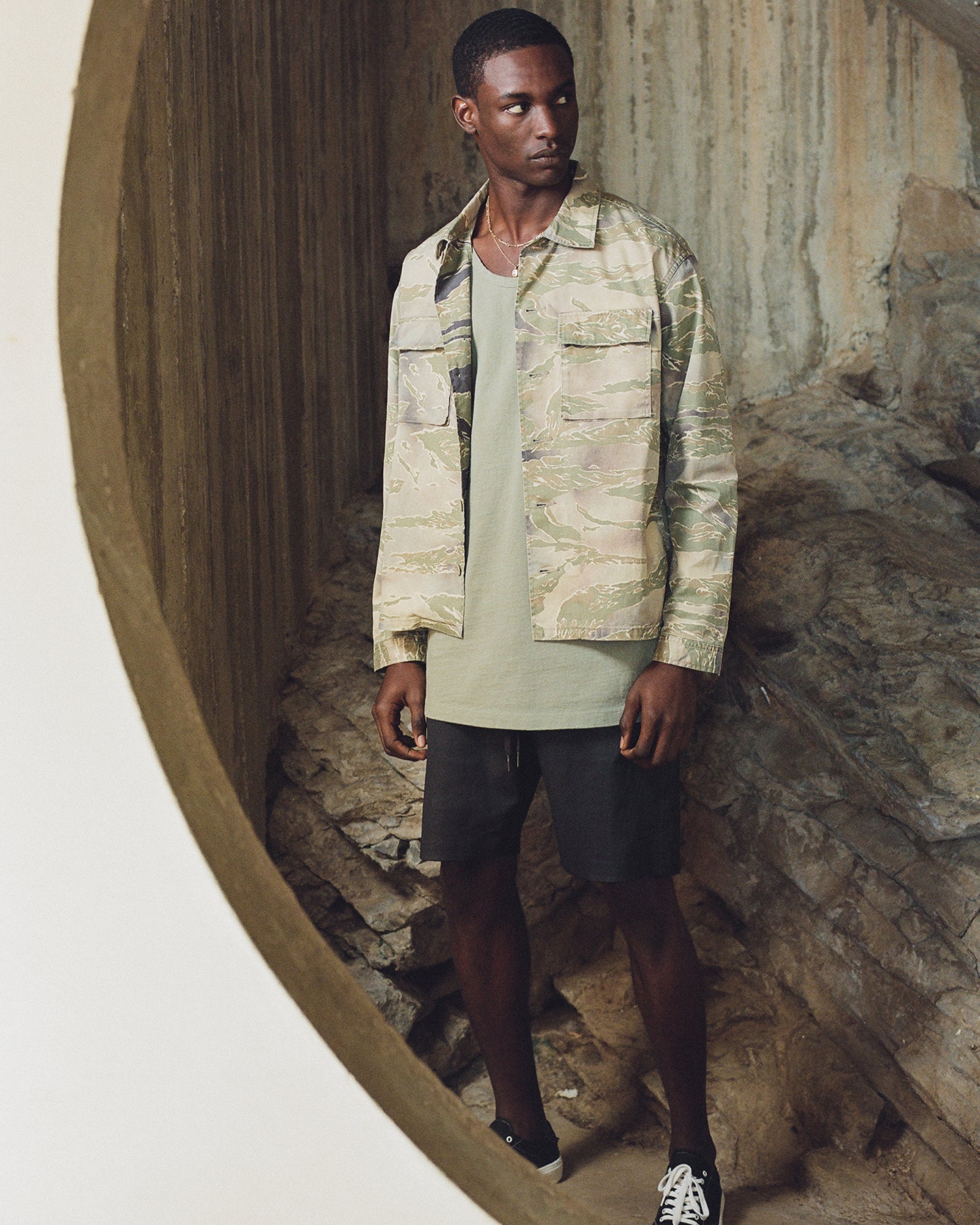 The Lookbook was shot on location at Arcosanti, an experimental town in Arizona thats concept was proposed by the Italian-American architect Paolo Soleri. Muted, earthen tones, seemingly washed by the sun, are featured throughout the collection. A tiger-camo trench, deliberately finished with a laborious bleaching process, is paired with hand painted denim, inspired by Jackson Pollock. Looks are elevated with new leather developments, and finished with the debut of a complete in-line footwear program.