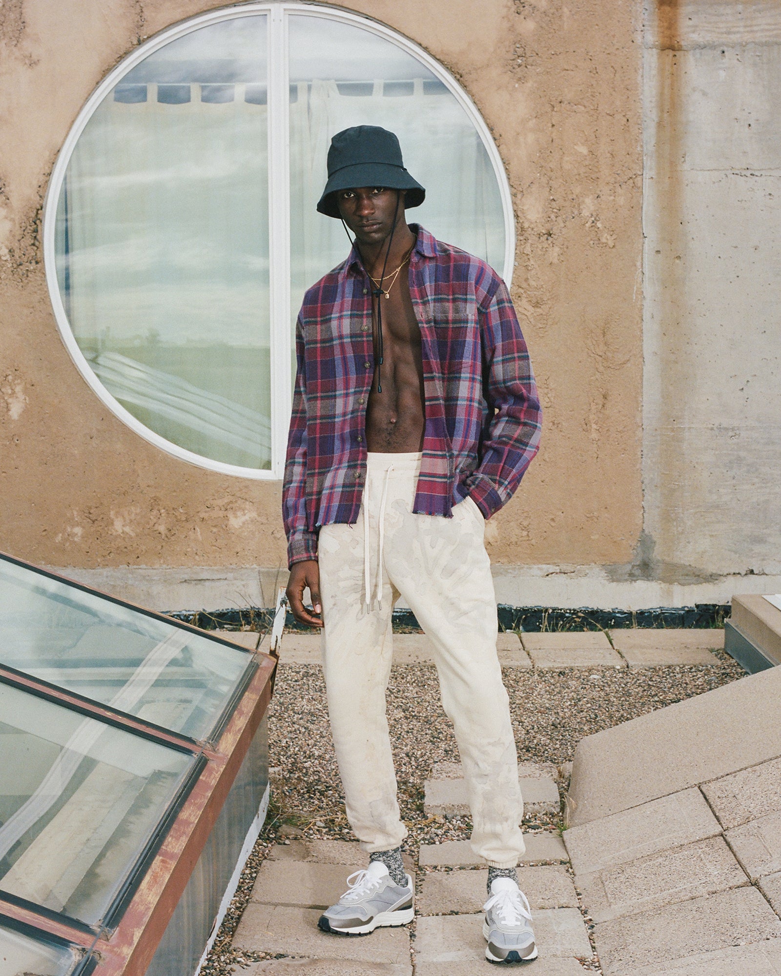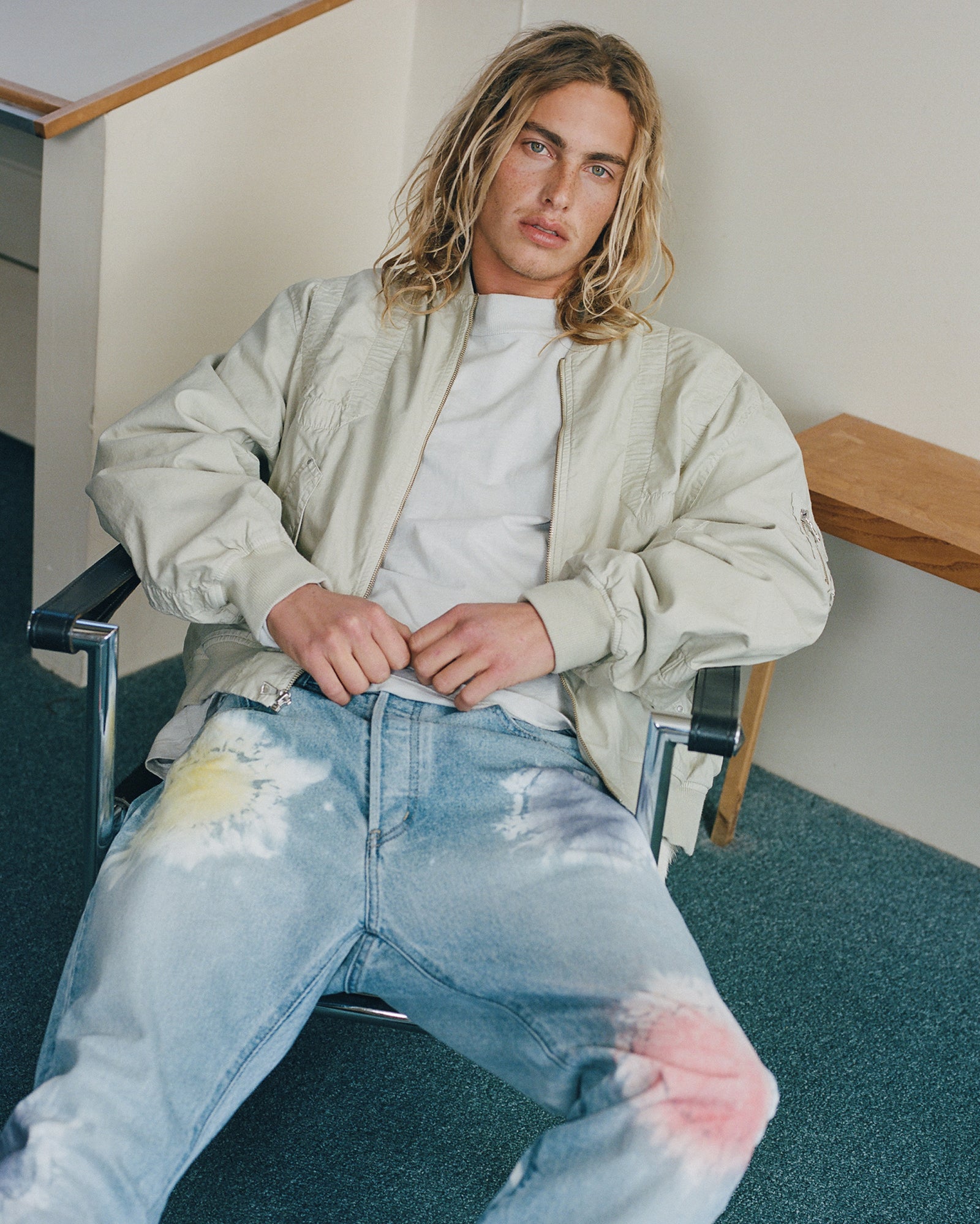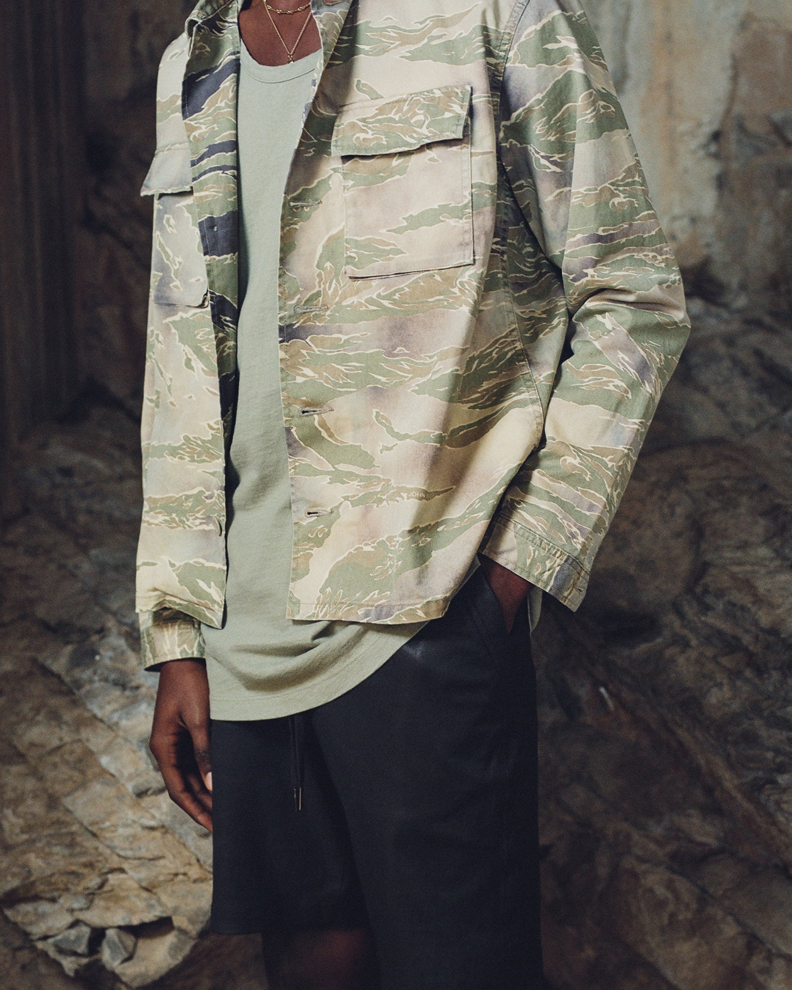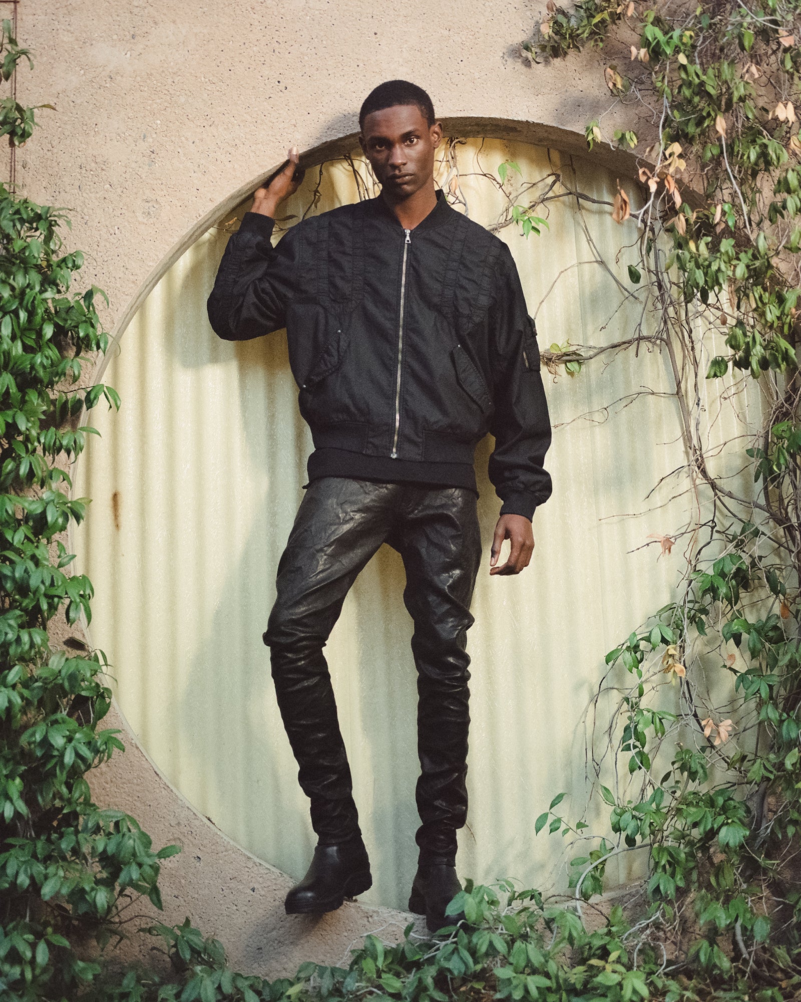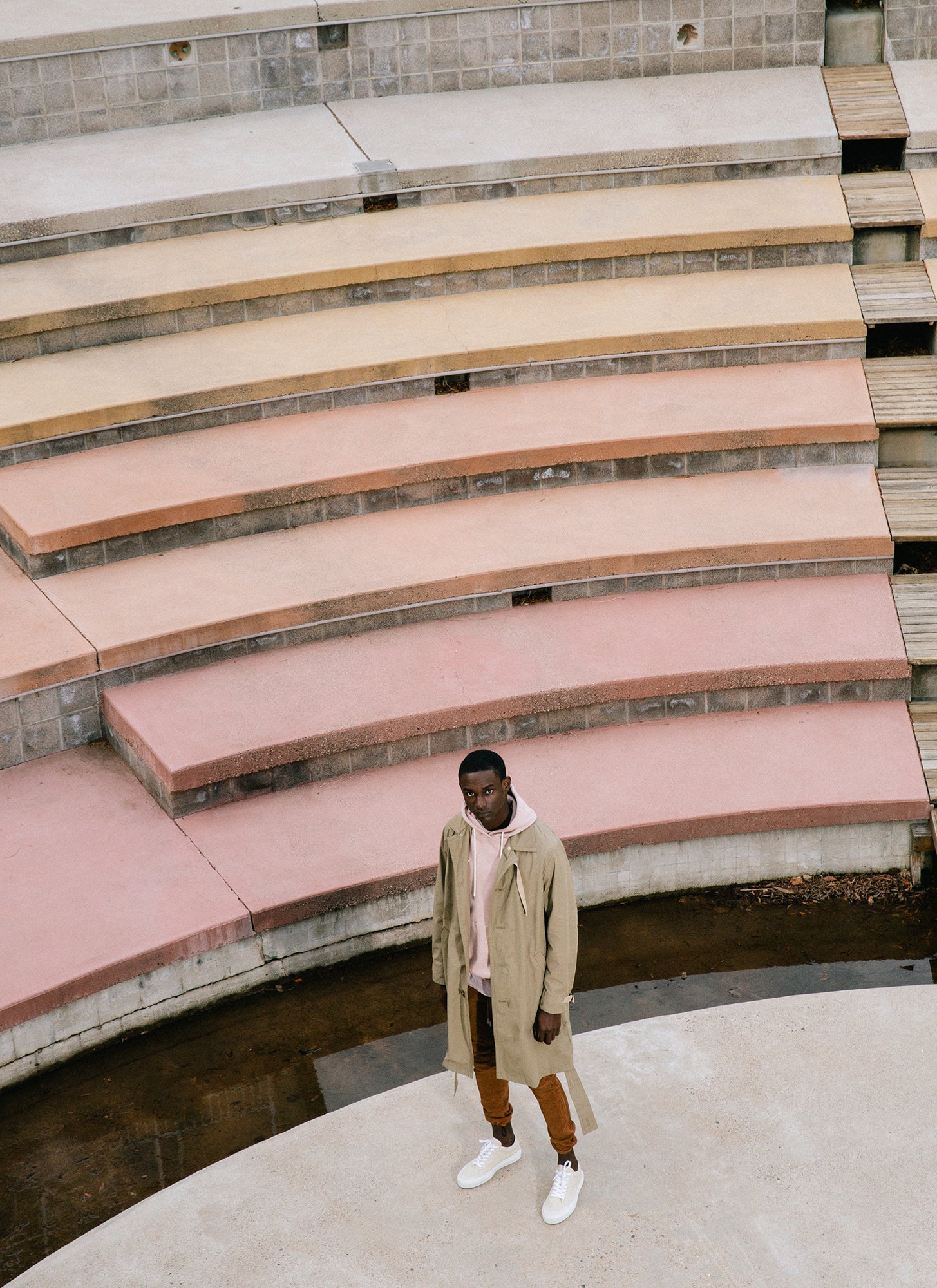 The Lookbook was shot on location at Arcosanti, an experimental town in Arizona thats concept was proposed by the Italian-American architect Paolo Soleri. Muted, earthen tones, seemingly washed by the sun, are featured throughout the collection. A tiger-camo trench, deliberately finished with a laborious bleaching process, is paired with hand painted denim, inspired by Jackson Pollock. Looks are elevated with new leather developments, and finished with the debut of a complete in-line footwear program.