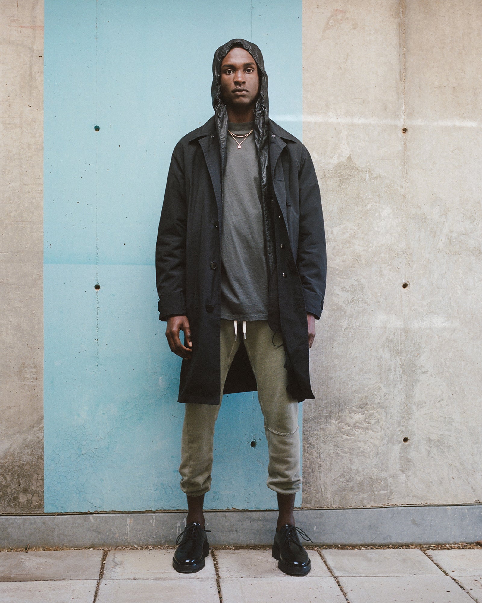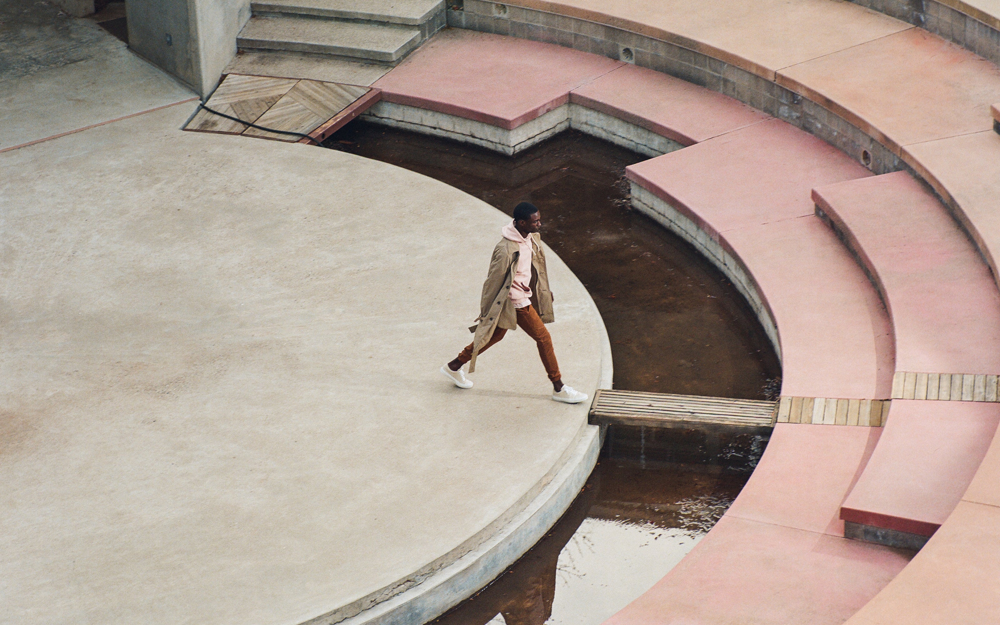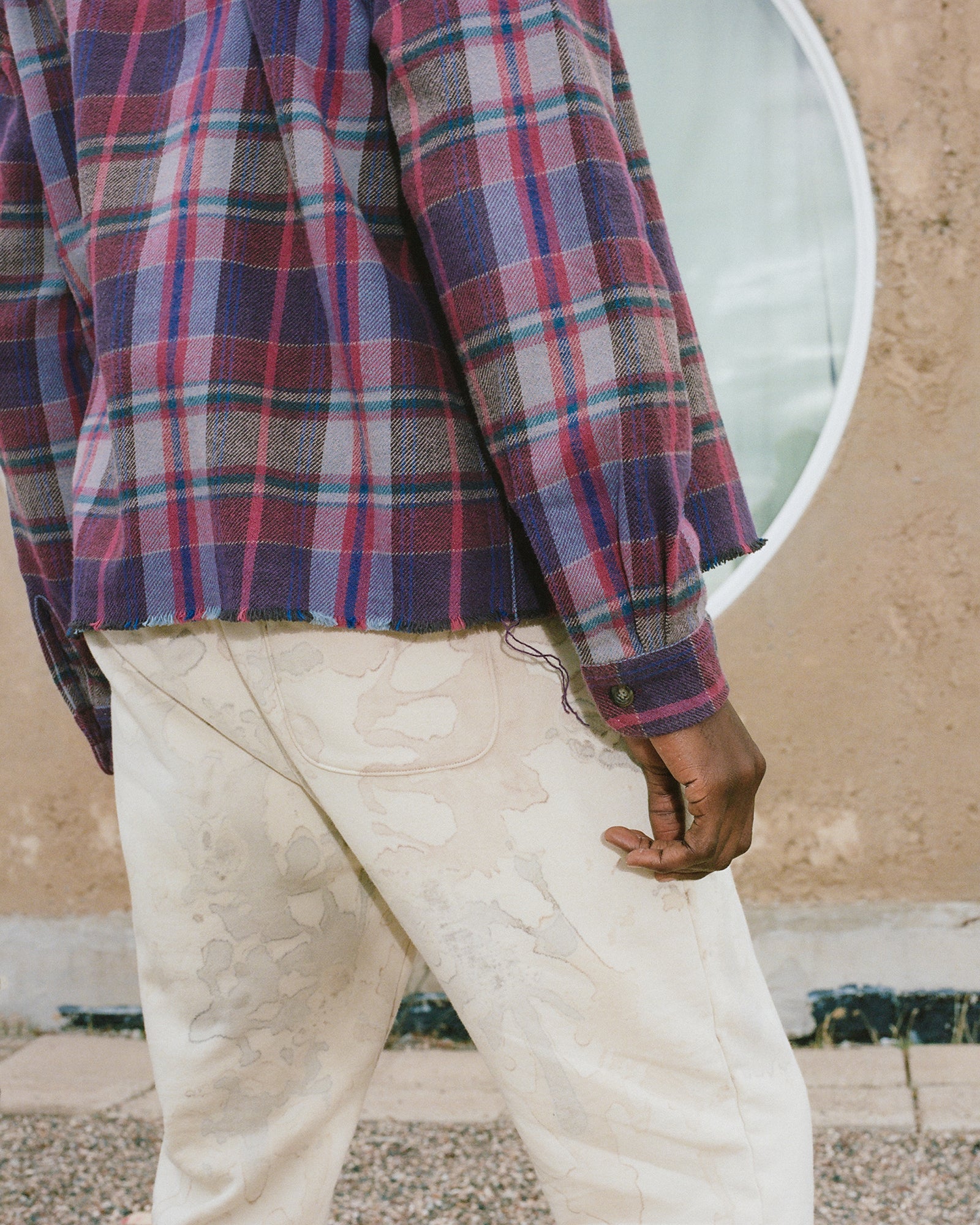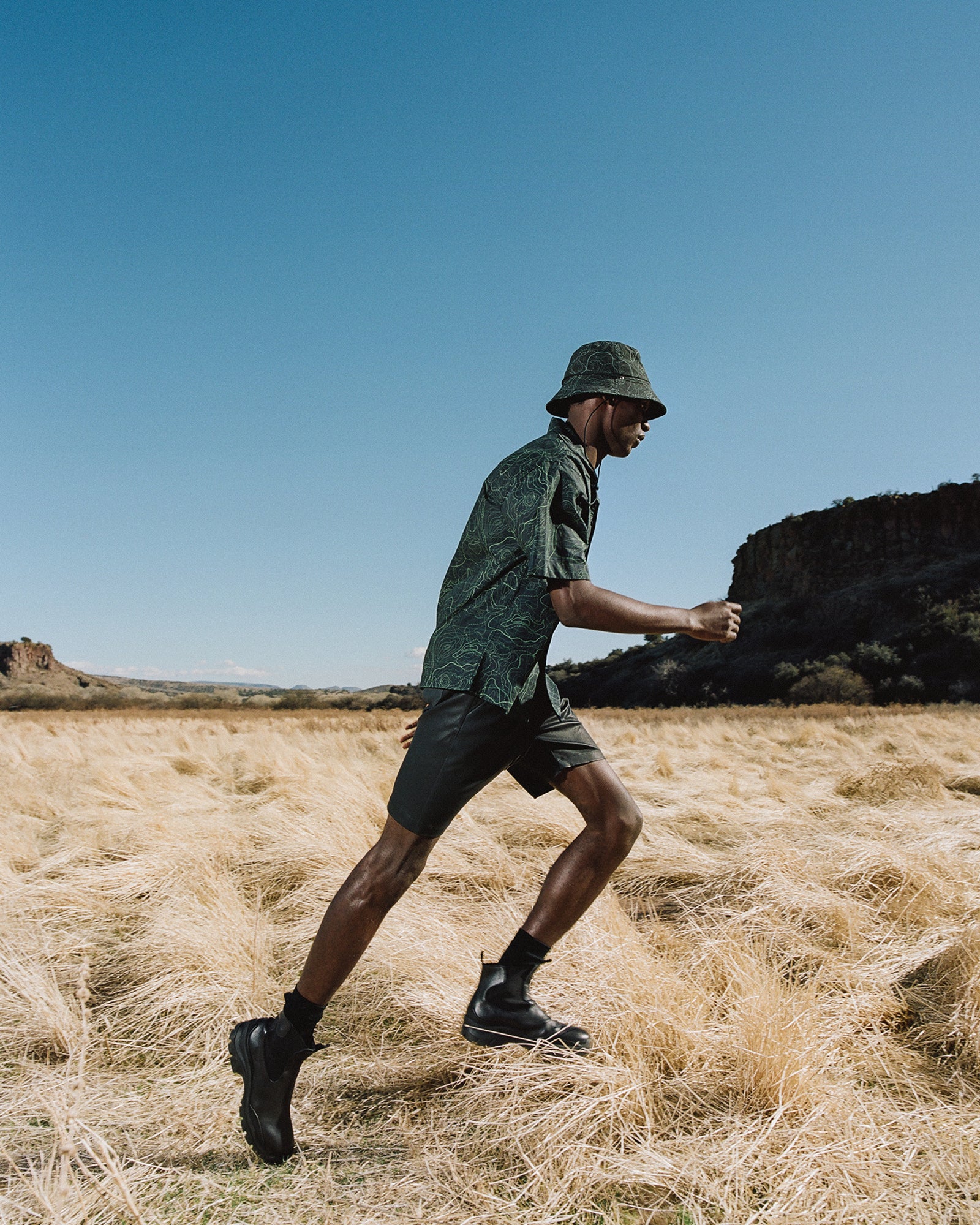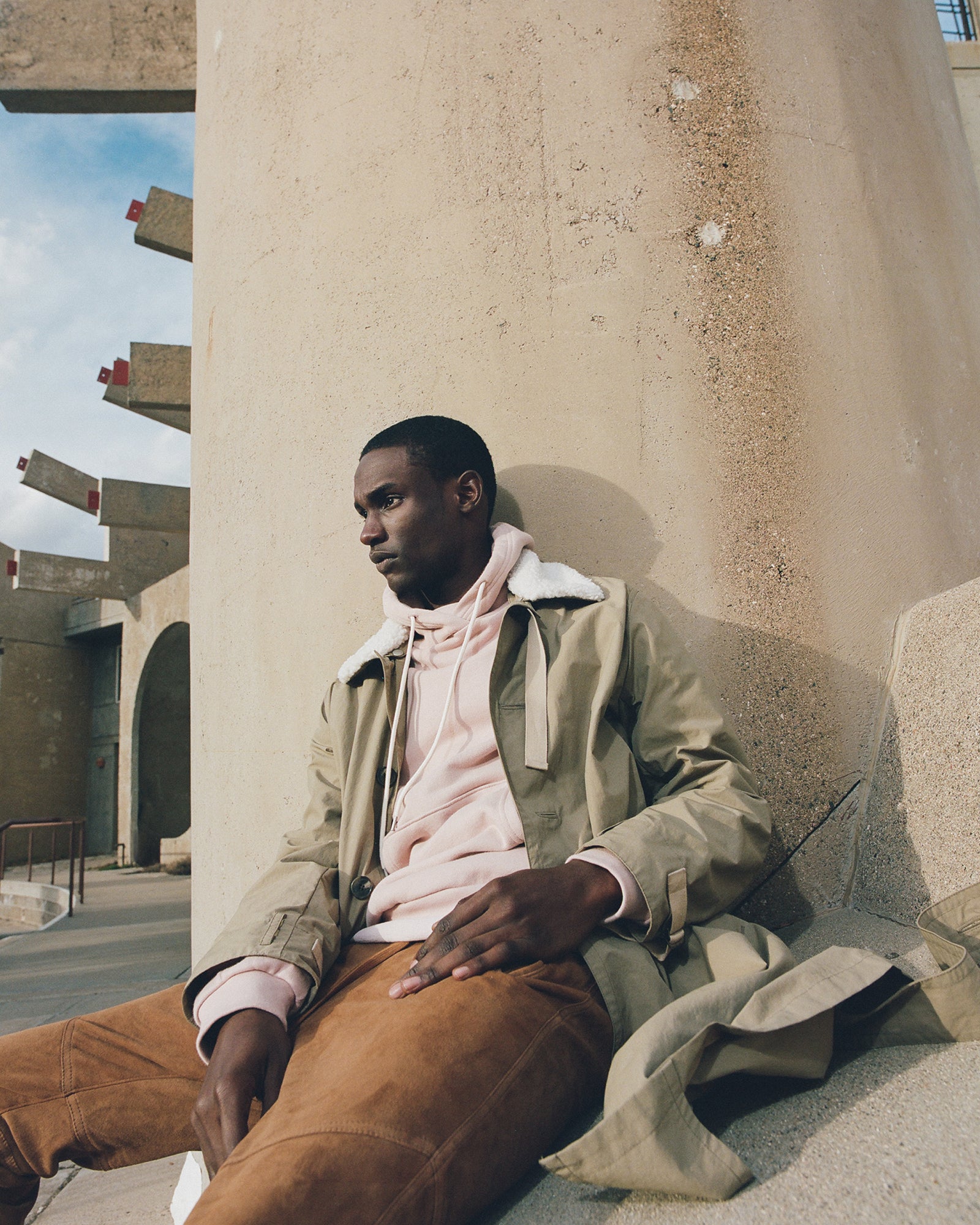 The Lookbook was shot on location at Arcosanti, an experimental town in Arizona thats concept was proposed by the Italian-American architect Paolo Soleri. Muted, earthen tones, seemingly washed by the sun, are featured throughout the collection. A tiger-camo trench, deliberately finished with a laborious bleaching process, is paired with hand painted denim, inspired by Jackson Pollock. Looks are elevated with new leather developments, and finished with the debut of a complete in-line footwear program.