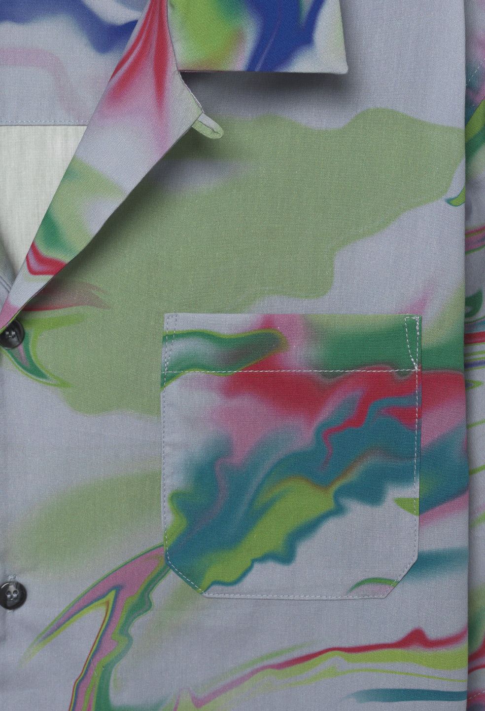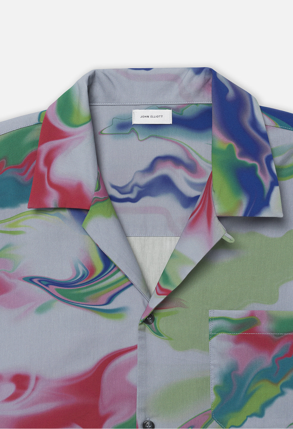 Custom 'Celestial' print camp shirt, crafted from a cotton-rayon blend for exceptional drape and a soft hand-feel. Features a button placket, chest pocket, and classic point collar. The relaxed, effortless silhouette seamlessly elevates any look, whether styled with semi-formal trousers or casual shorts.