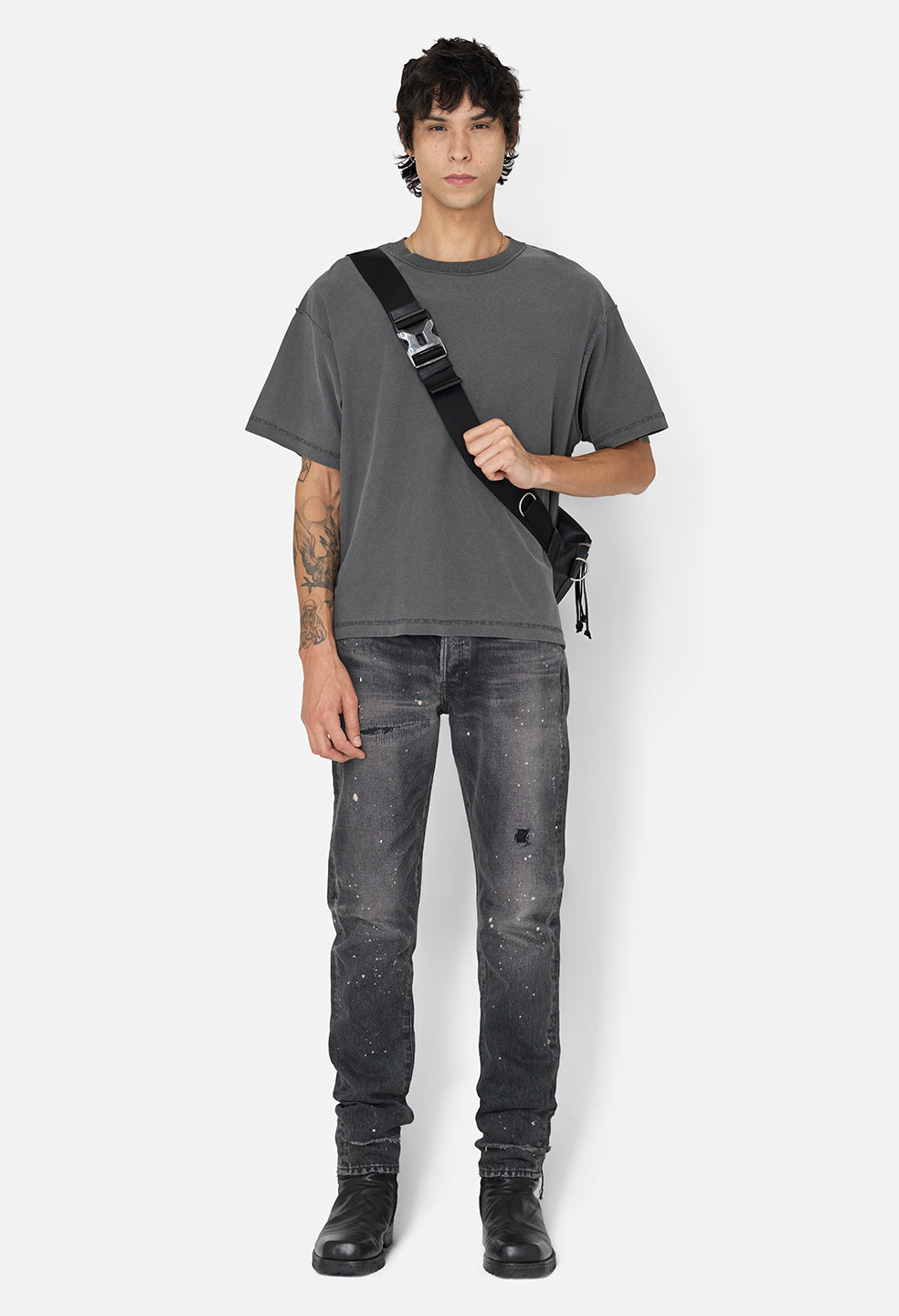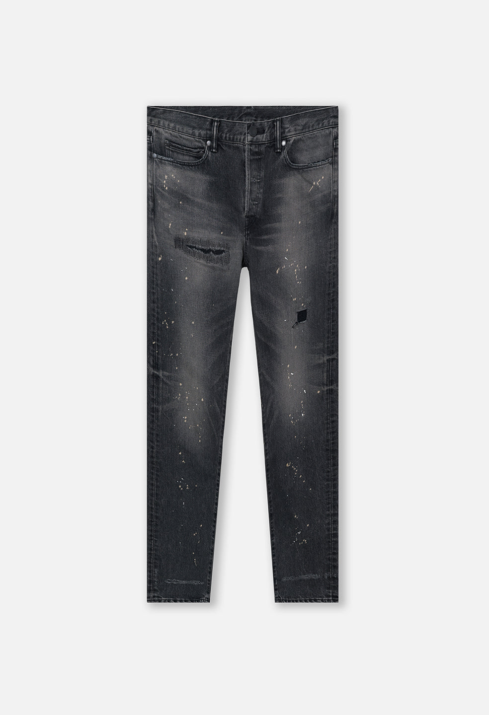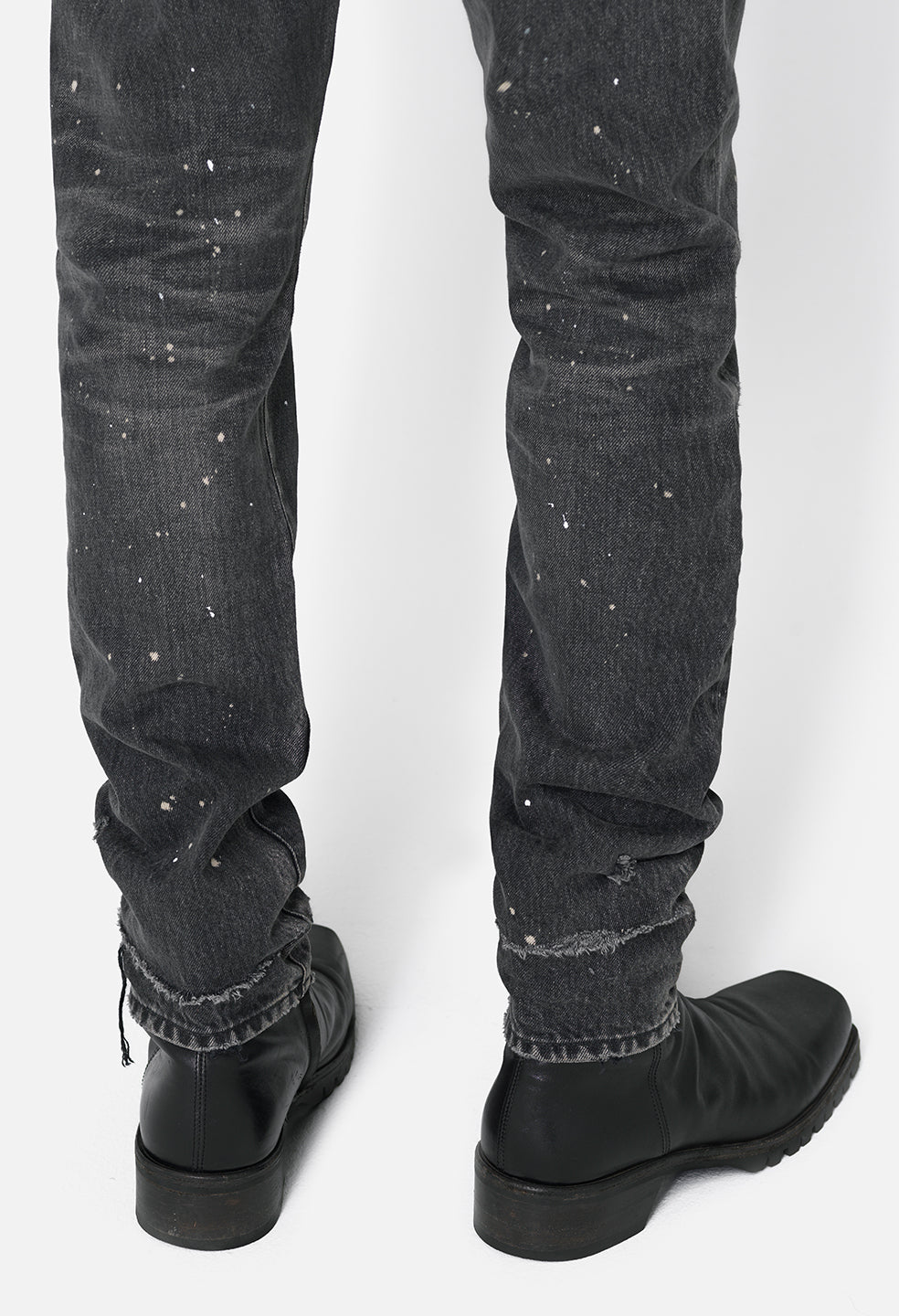 Japanese 3x1 woven denim in washed black. Destroys and repairs at the thighs and hems. Authentic whiskering and honeycomb details. Paint splatters throughout. Five pocket design with a button fly. Slim tapered fit with a low rise in the front and higher rise in the back. Tonal stitching. Chain-stitched hems. Made in Japan.