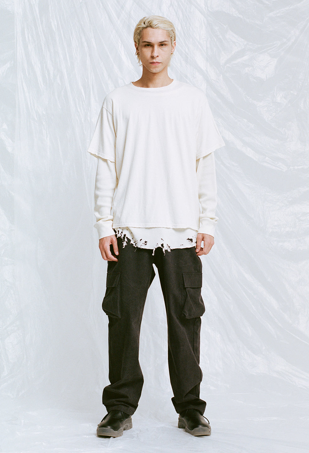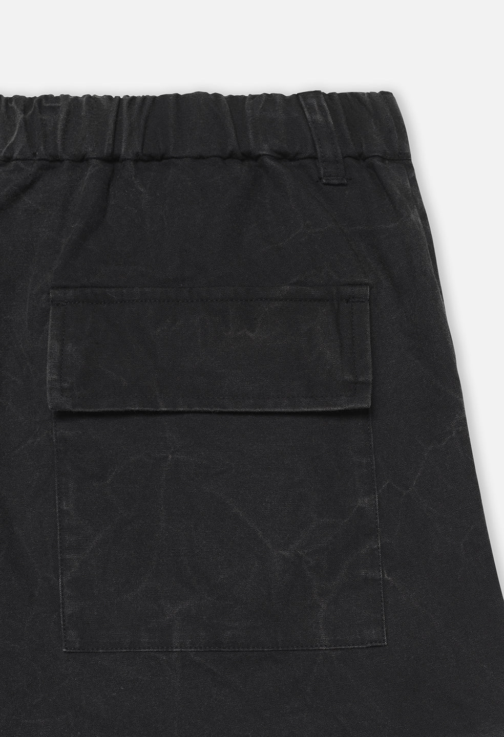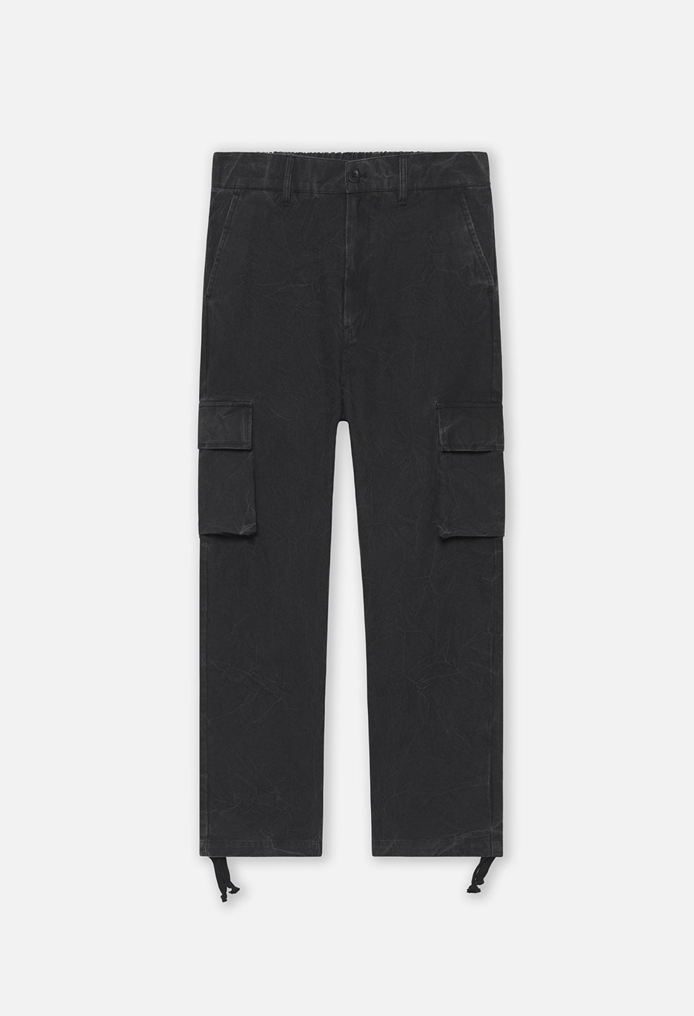Cargo pants in heavyweight back sateen fabric. Garment dyed and washed with a unique process that creates a subtle 'crunch' effect throughout. These pants feature two slant pockets at the front, cargo pockets at the sides, and a flap closure pocket at the seat. Button closure with a zip fly. Belt bands at the waist. Semi-elasticated waistband at the seat for a comfortable fit. Adjustable drawstrings at the hems allow for versatility in styling.