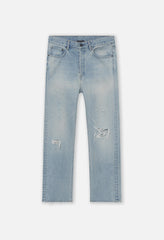 Japanese 3X1 denim in washed light indigo. Vintage-inspired knee destroy, with distressing throughout. Tonal stitching. Wide leg fit with a medium rise. Five pocket design with a button fly. Made in Japan.