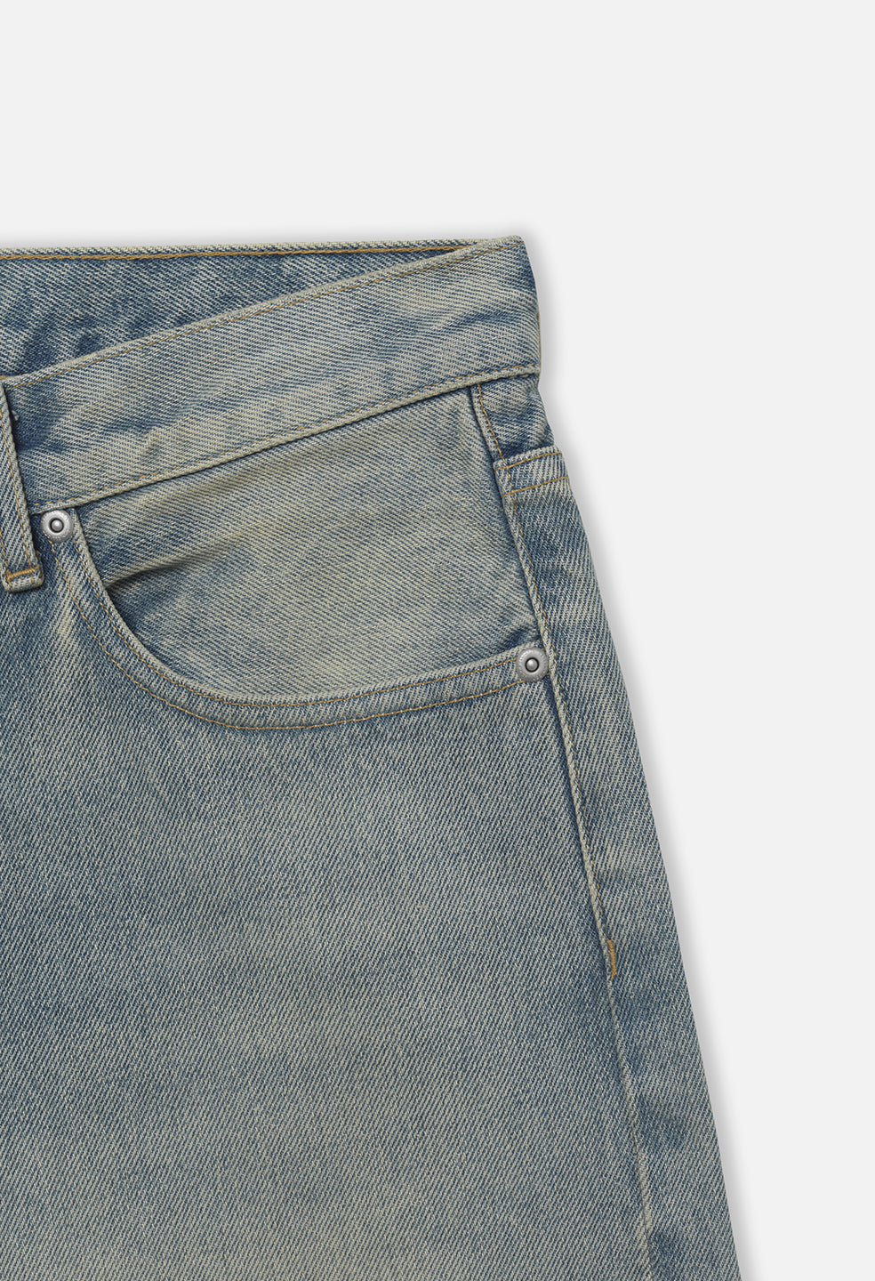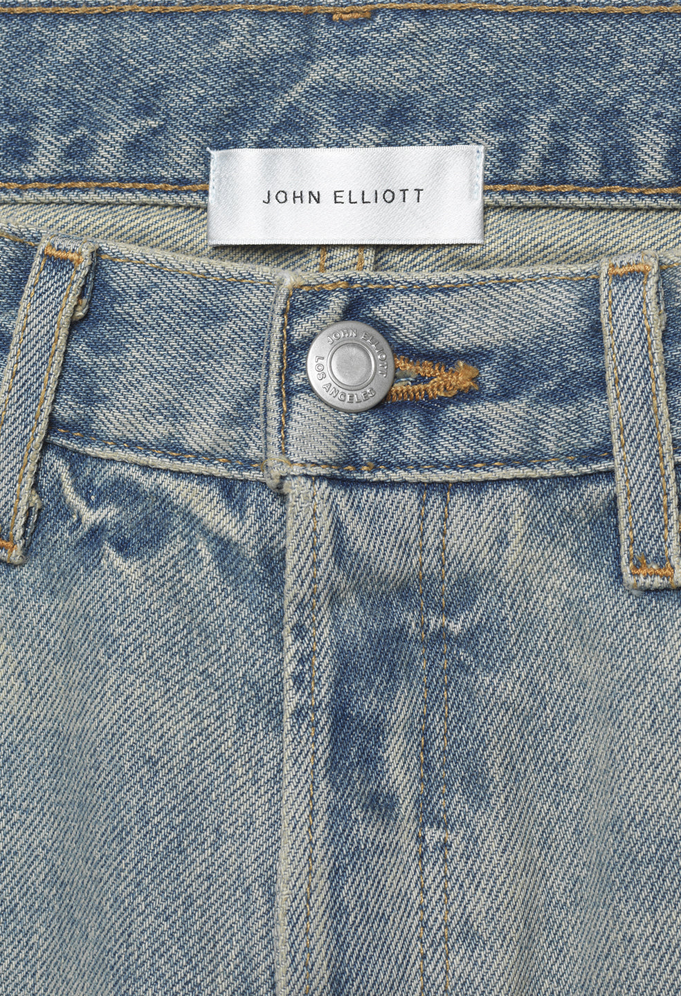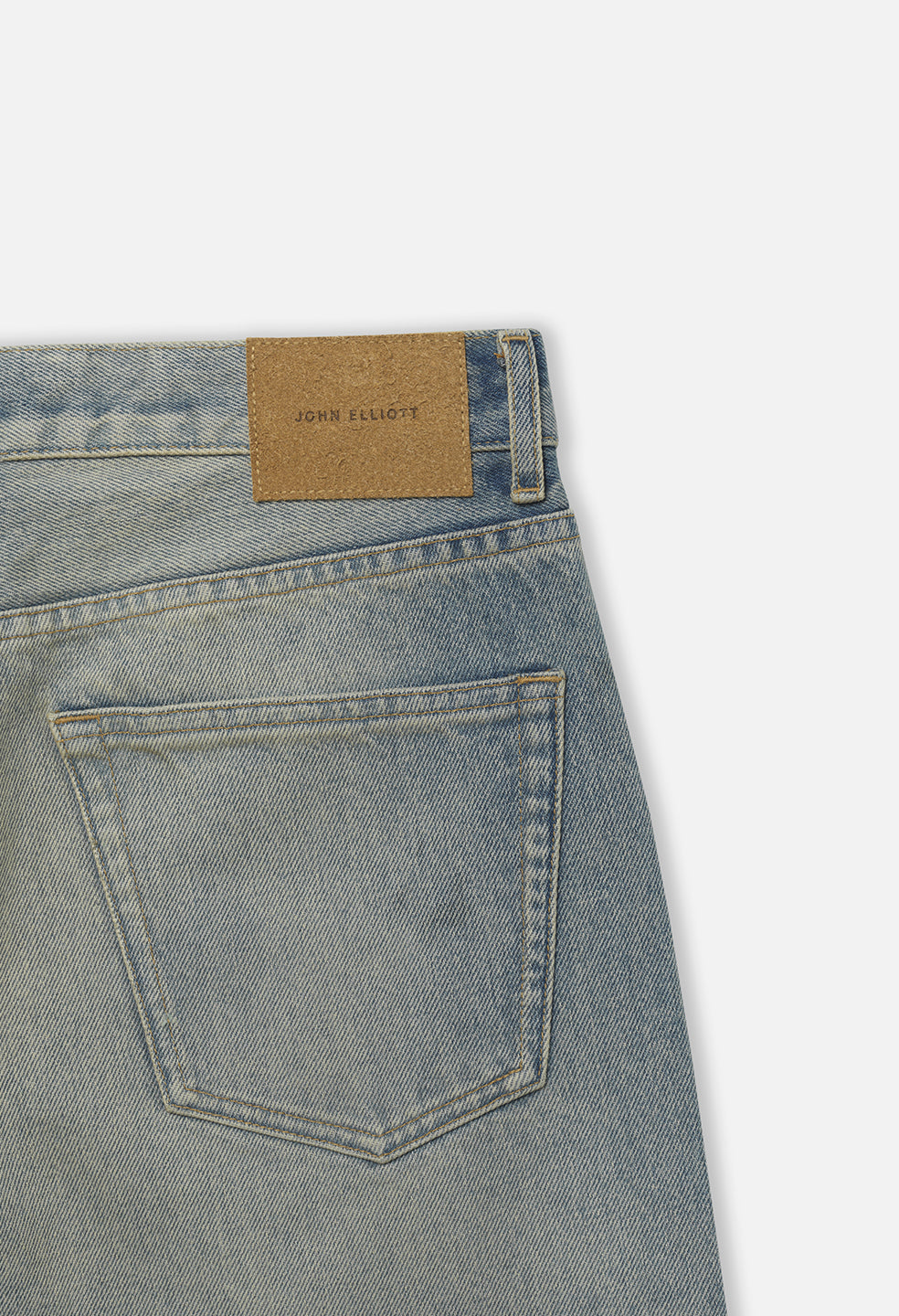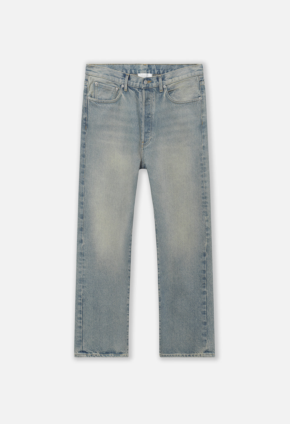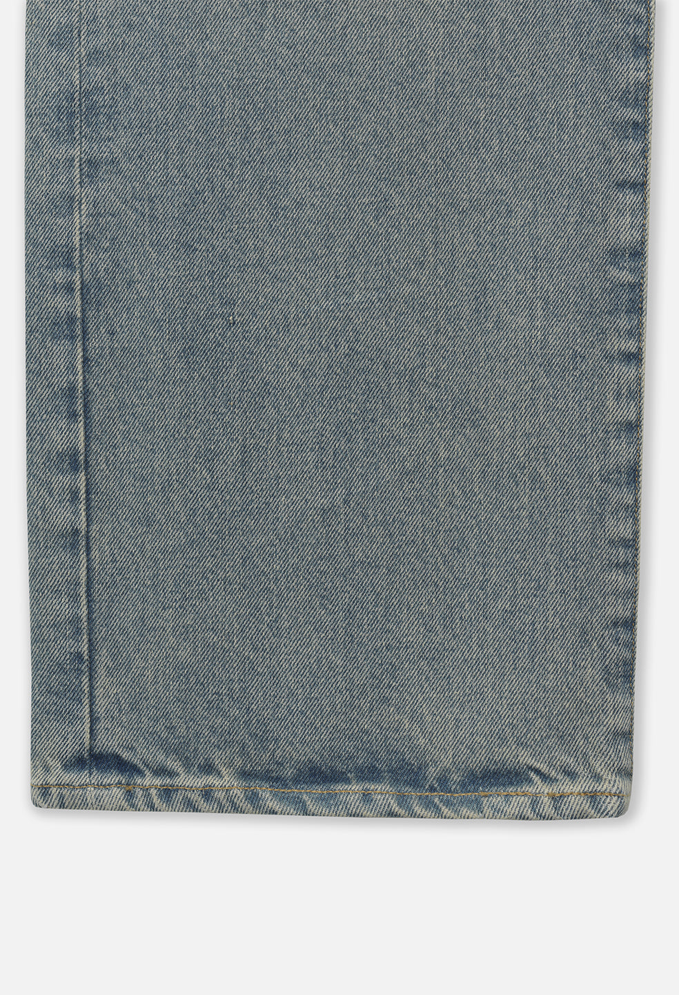3X1 Cone Mills denim in classic 'Coast' washed indigo. Wide leg fit with a medium rise. Five pocket design with a button fly. Branded hardware. Suede logo patch at the back waist. Classic contrast stitching. Made in Los Angeles.